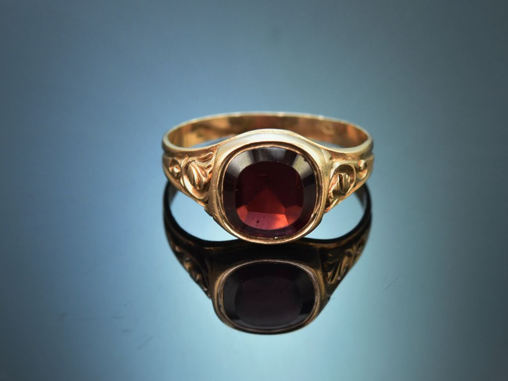 Der quadratisch, gerundete Ringkopf ist mit einem schönen, tiefroten Granat in Tafelschliff besetzt. Eine feine, floral verzierte Ringschulter rundet den hübschen, zeittypischen Entwurf ab.
