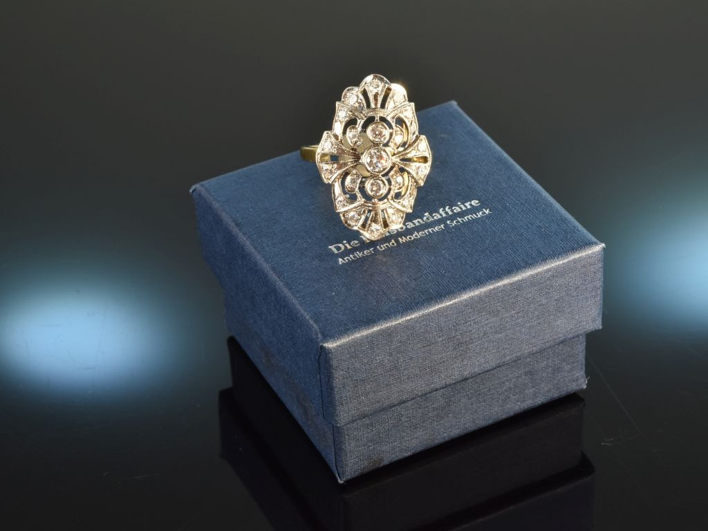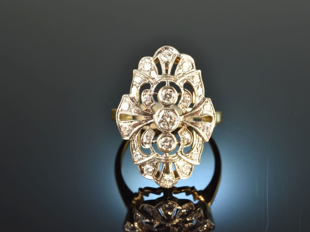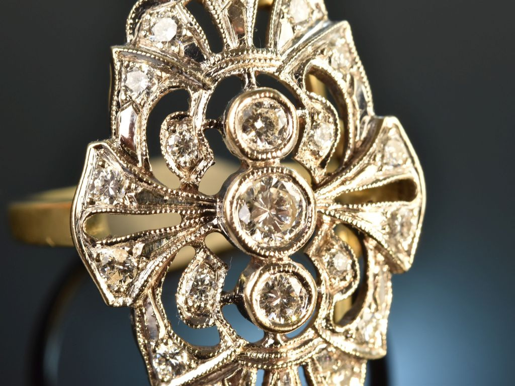 Den schildförmigen, durchbrochen gearbeiteten Ringkopf zieren insgesamt 21 Diamanten in Brillantschliff, mit einem Steingewicht von zusammen ca. 1,0 Carat und von schöner Qualität (G-H, VVS2-VS1). Die Fassungen der Diamanten sind zusätzlich mit elegantem Millegriffe-Dekor verziert, eine Technik, die vor allem im ersten Drittel des 20. Jahrhunderts üblich war und dann aber gerne noch bis in die 50er Jahre angewendet wurde. Eine schlichte und stabile Ringschiene aus Gelbgold rundet den schönen Entwurf des Ringes ab.