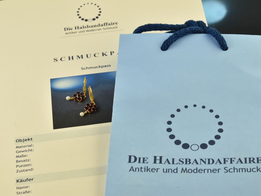 Besatz: 14 Granate im Taffelschliff, ca. 3,0 mm im Durchmesser. 2 Saatperlen, ca. 3,0 mm im Durchmesser.