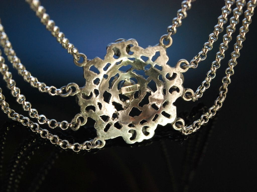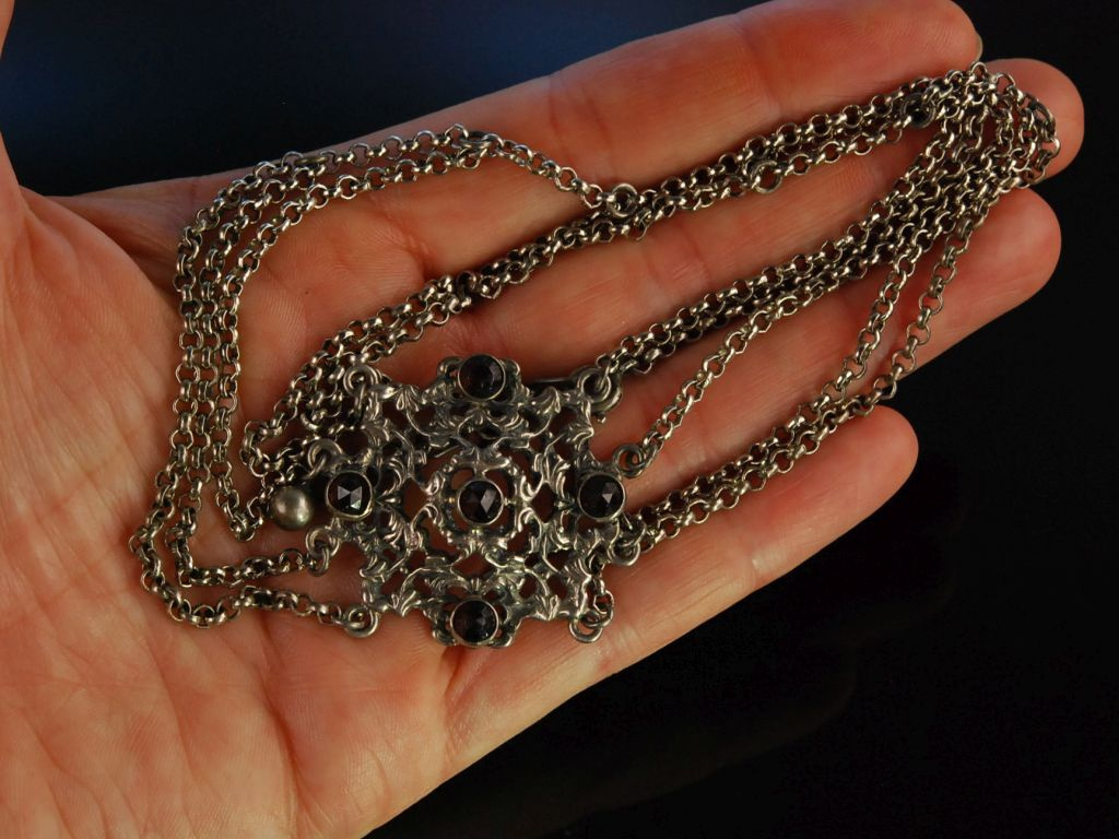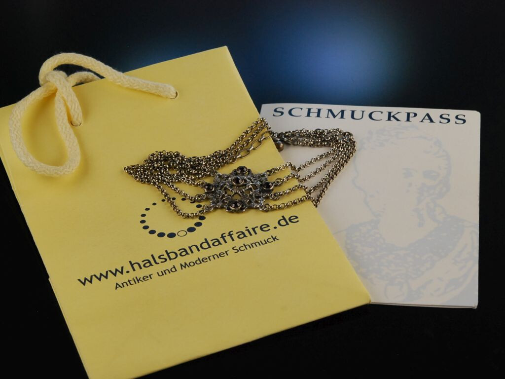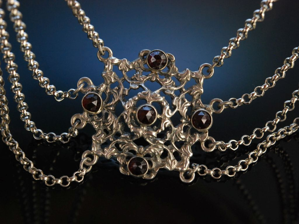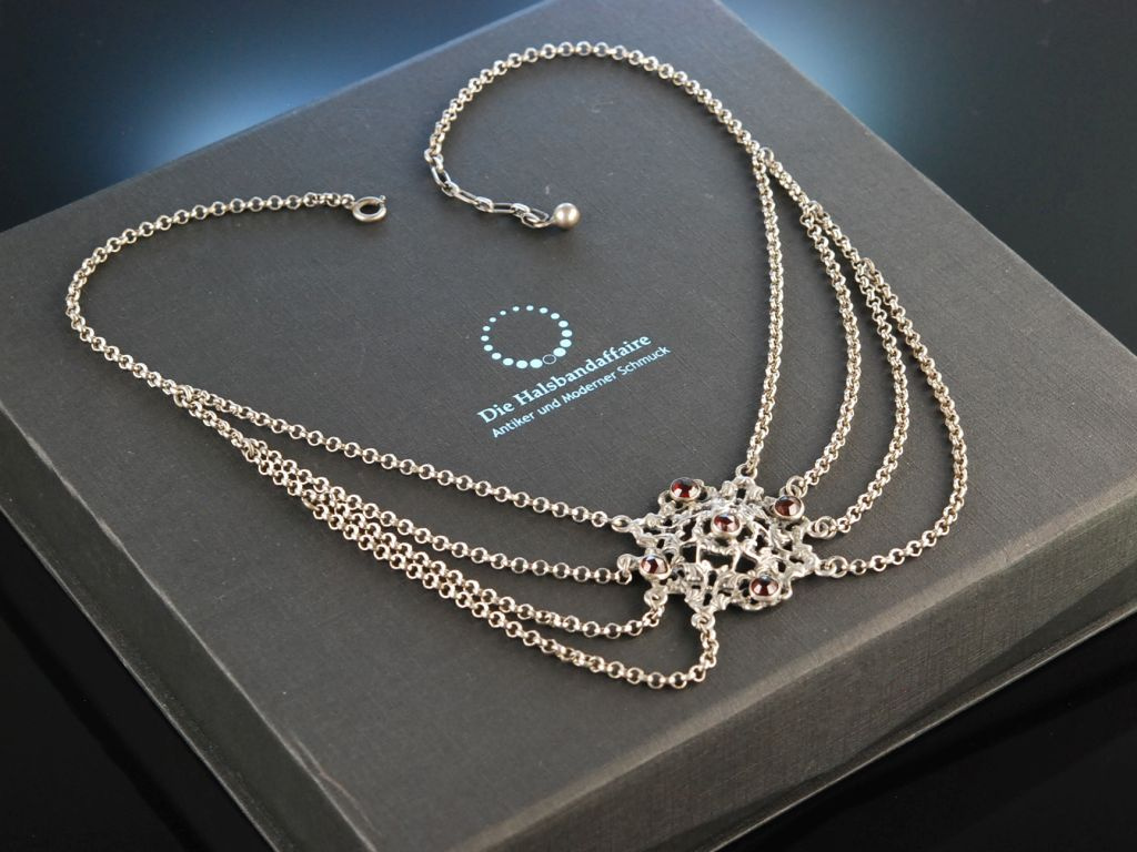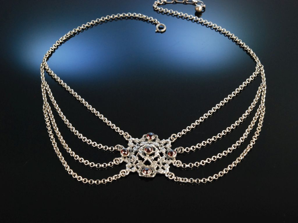Wundervolle Trachtenkropfkette aus Silber 835 (gestempelt und garantiert). Die Kropfkette ist vorne aus vier Reihen und hinten aus einer Reihe Erbsketten gearbeitet und mit einer Kartusche mit geschwungenem Rankendekor verziert. Mittig ist die Kartusche mit fünf wunderbar rot funkelnden, facettierten Granaten im Rosenschliff besetzt. Die Granate haben ein Steingewicht von zus. ca. 2 Carat. Rückseitig wird das Trachtencollier mit einer gut funktionierenden Federringschließe geschlossen. Durch eine kleine Verlängerungskette ist die Länge variabel einstellbar. Die hübsche Trachtenkette entstand um 1930 in München und ist eine schöne Ergänzung zu Tracht und Dirdl.