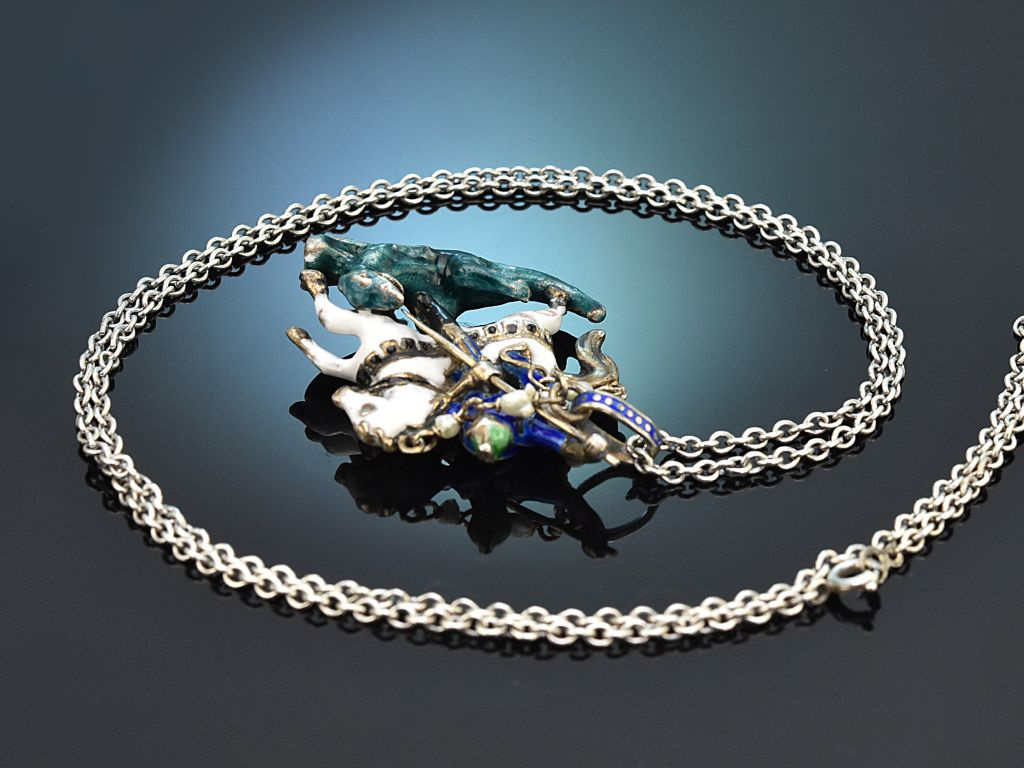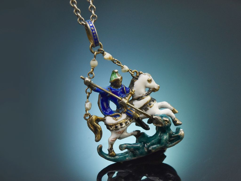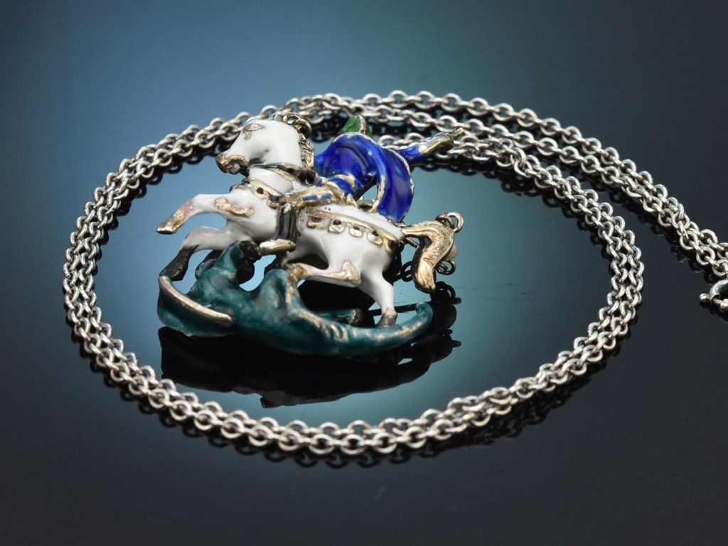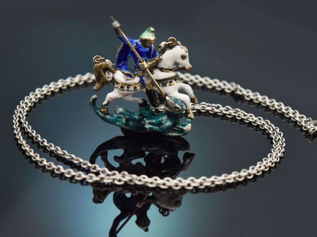 An einer stabilen Ankerkette aus Silber hängt ein plastisch gearbeiteter Anhänger mit dem Motiv des heiligen Georg in der bekannten Darstellung zu Pferd beim Kampf gegen den Drachen. Eine kunstvolle Auflage aus Zieremaille gibt dem Motiv eine besondere Lebendigkeit und besticht zudem noch durch die harmonische Farbgebung in Blau-und Grüntönen. Zwei mit Perlen verzierte Stränge, die jeweils vom Schweif und Kopf des Pferdes ausgehen, münden in die ebenfalls emaillierte Anhängeröse und verhindern ein Drehen des Anhängers beim Tragen.