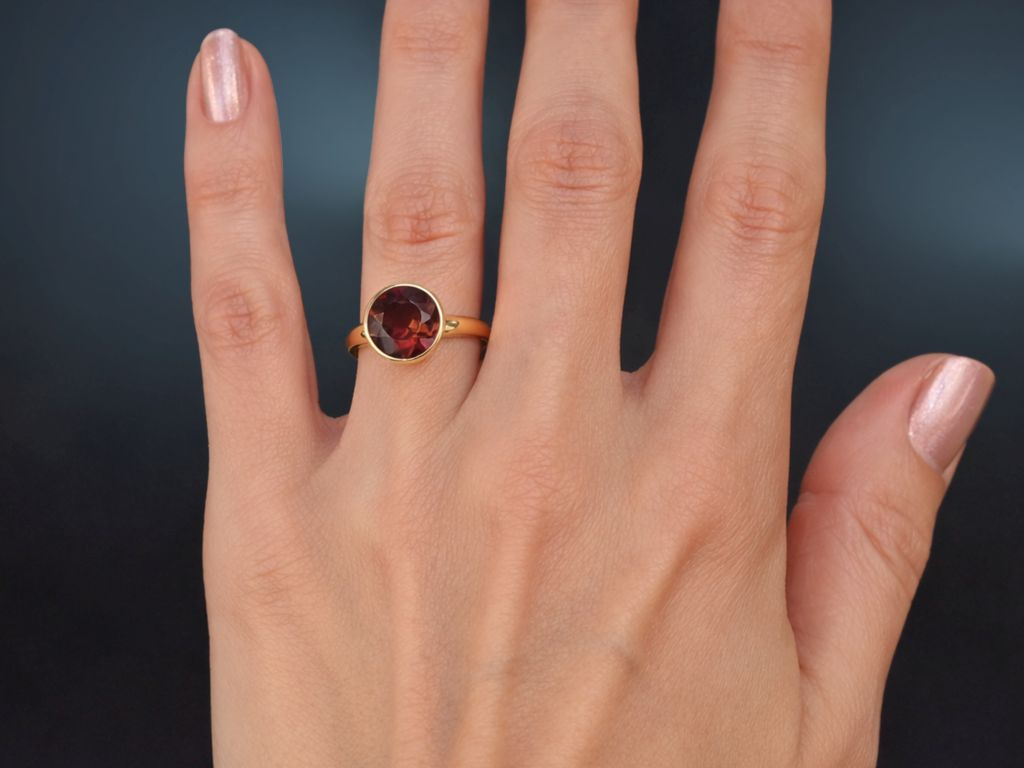 Der erhöhte Ringkopf ist mit einem traumhaften brombeerfarbenen Turmalin in rundem Facettenschliff besetzt. Der schöne Edelstein von 4,23 Carat wird durch seine goldene Zargenfassung maximal betont und von einer schmalen Ringschiene begleitet.