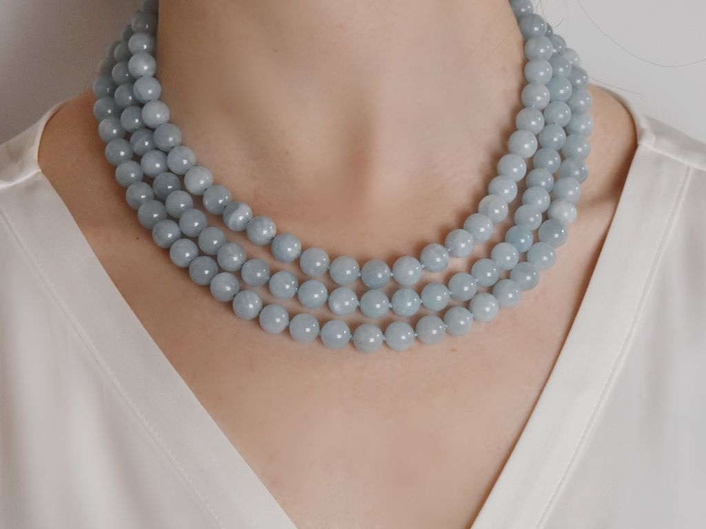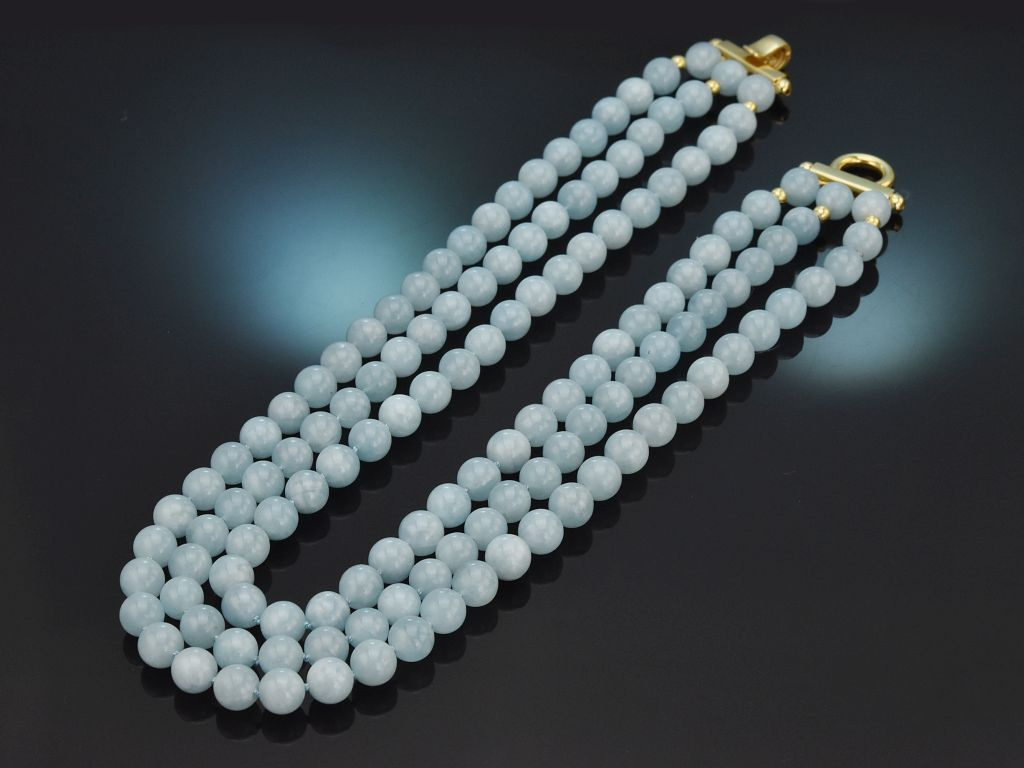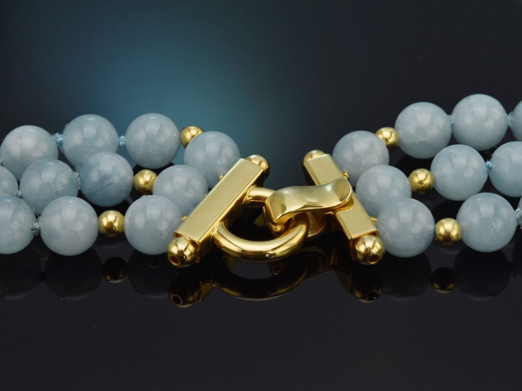 Die dekorative Kette besteht aus drei Reihen polierter, halbopaker Aquamarin-Kugeln mit wunderschönen, fein changierenden, zarten Blautönen und einer dezenten Maserung. Kleine Zierelemente aus vergoldetem Silber setzten außerdem auf der Rückseite noch einen hübschen Akzent und passen perfekt zu der praktischen Klappschanier-Schließe.