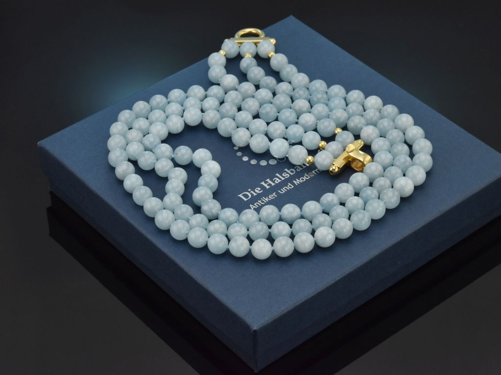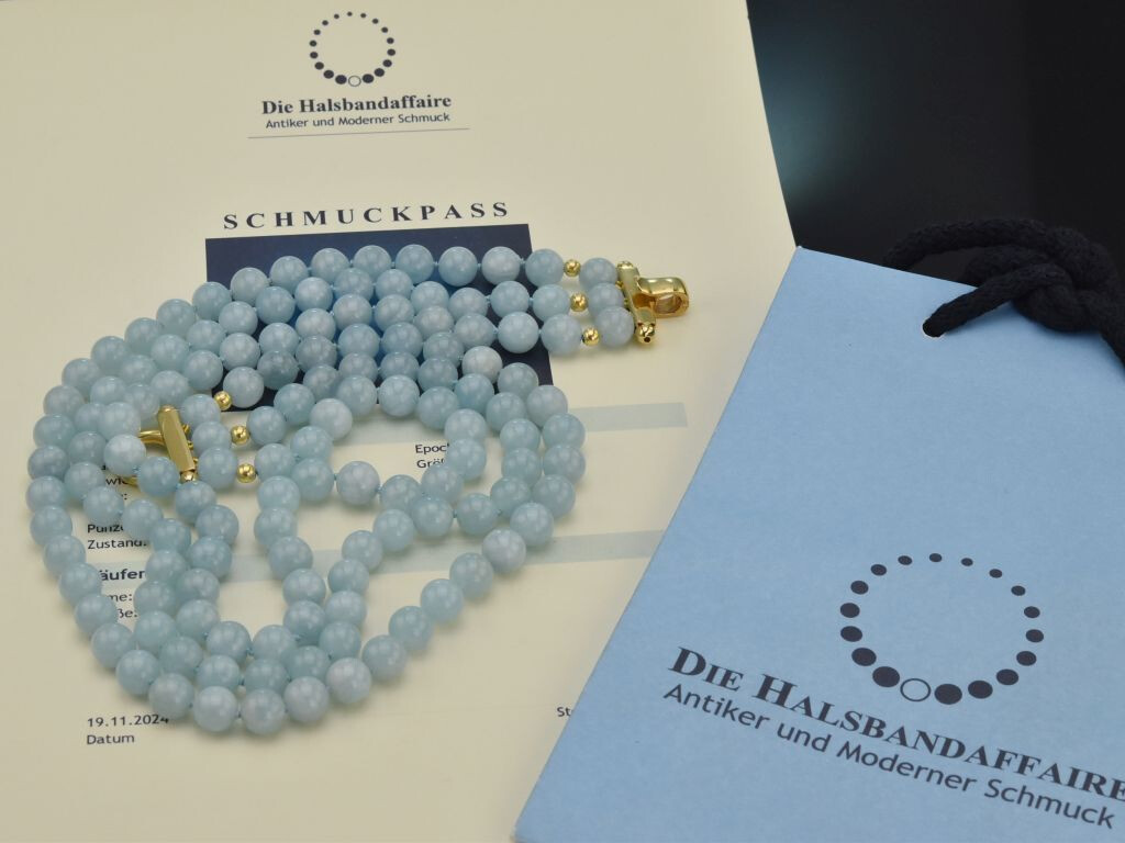 Die schöne Edelsteinkette wurde in unserer Werkstatt entworfen und geknüpft. Sie besticht vor allem durch ihre elegante himmelblaue Farbe des schönen Aquamarins. Durch ihren klassischen und zeitlosen Entwurf lässt sie sich zudem zu vielen Gelegenheiten kombinieren.