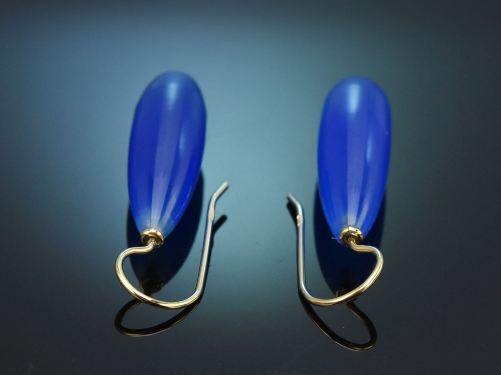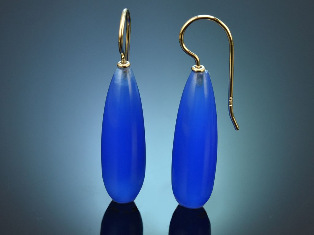 An goldenen, handgeschmiedeten Hakenbrisuren ist jeweils ein länglicher Tropfen aus Blauachat angebracht. Der Edelstein besticht durch sein intensives, leuchtendes Blau, das besonders gut zu dem Goldton der Brisuren passt.