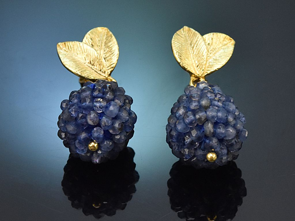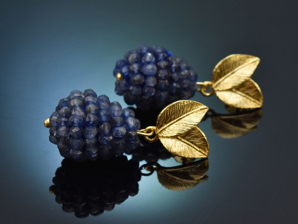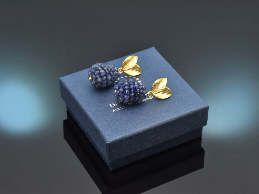 Die floralen Ohrringe stammen aus unserer Werkstatt und begeistern durch die tiefe blaue Farbe der Edelsteine, die wunderbar mit den vergoldeten Brisuren harmoniert!