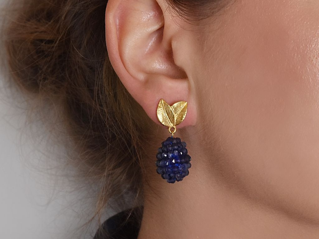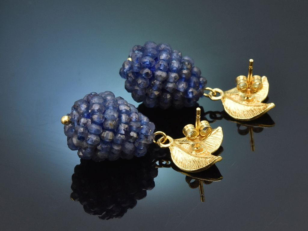 Die fein ausgearbeiteten blattförmigen Brisuren dieser eleganten Ohrringe sind aus vergoldetem Sterlingsilber gearbeitet. Daran schwingt je ein gefädelter Tropfen aus facettierten, dunkelblau glitzernden Iolithkügelchen.