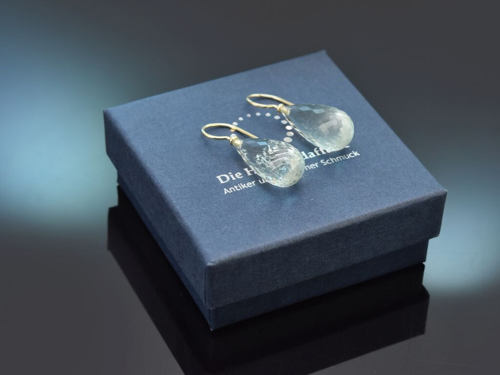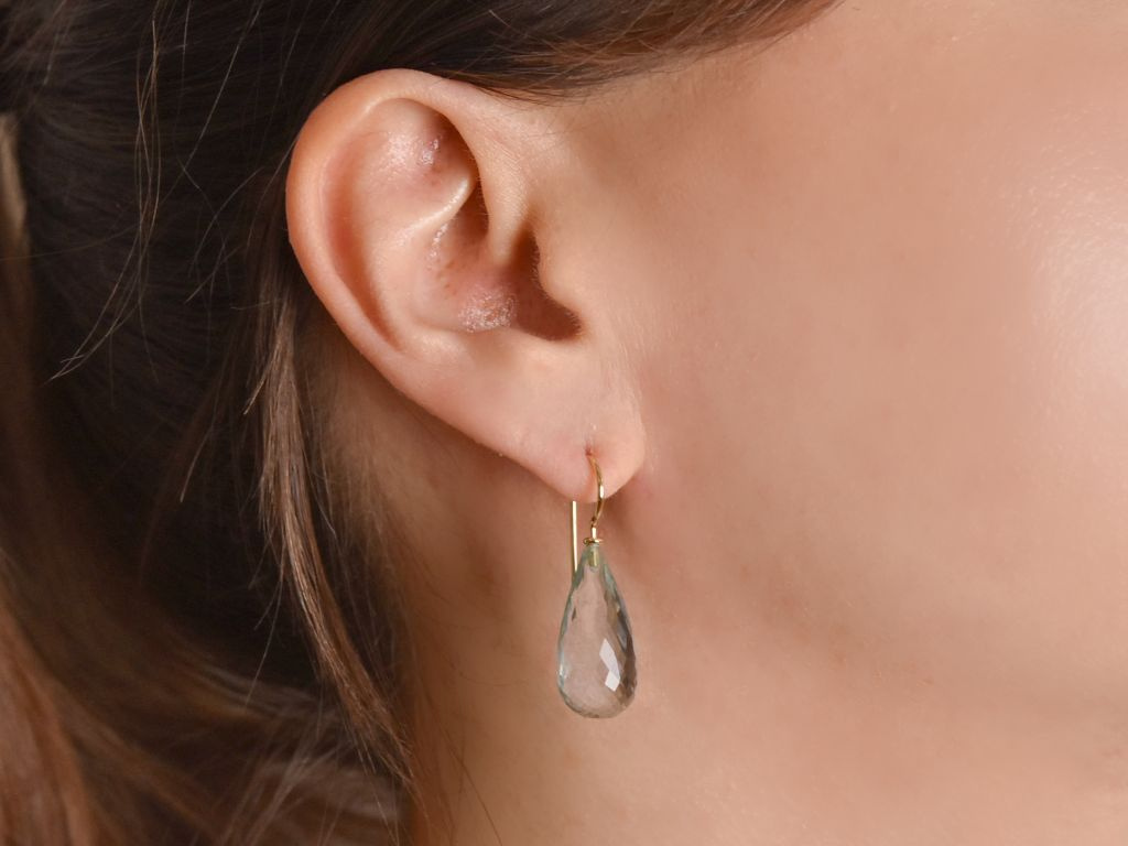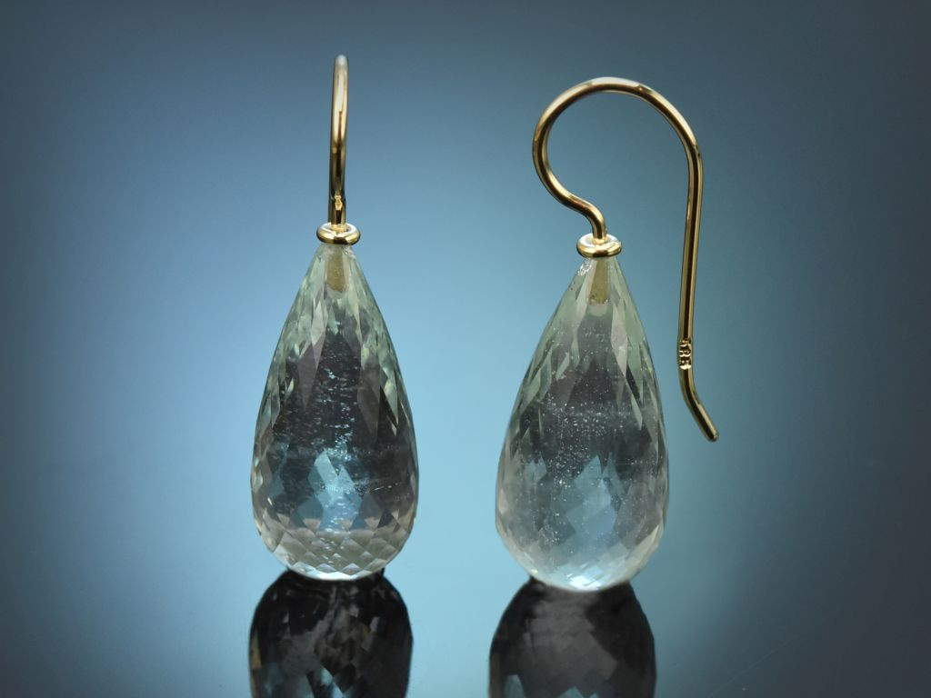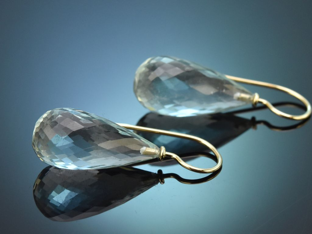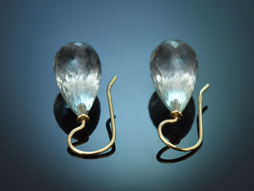 An hochwertigen und handgearbeiteten Hakenbrisuren aus Gelbgold sitzt jeweils ein Aquamarin Tropfen in Briolettschliff. Durch den schönen Schliff schimmert das zarte Blau der Aquamarine besonders gut und harmonisiert hervorragend mit dem warmen Gold der Brisuren.