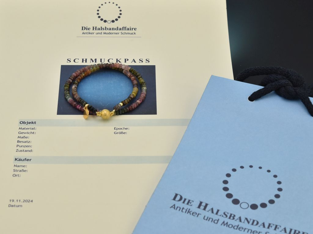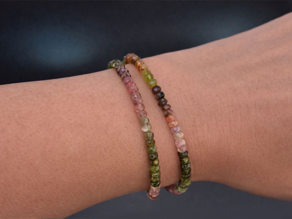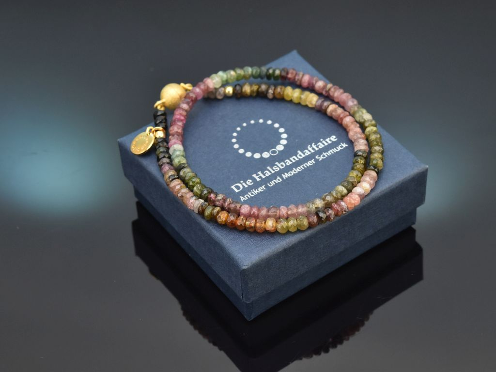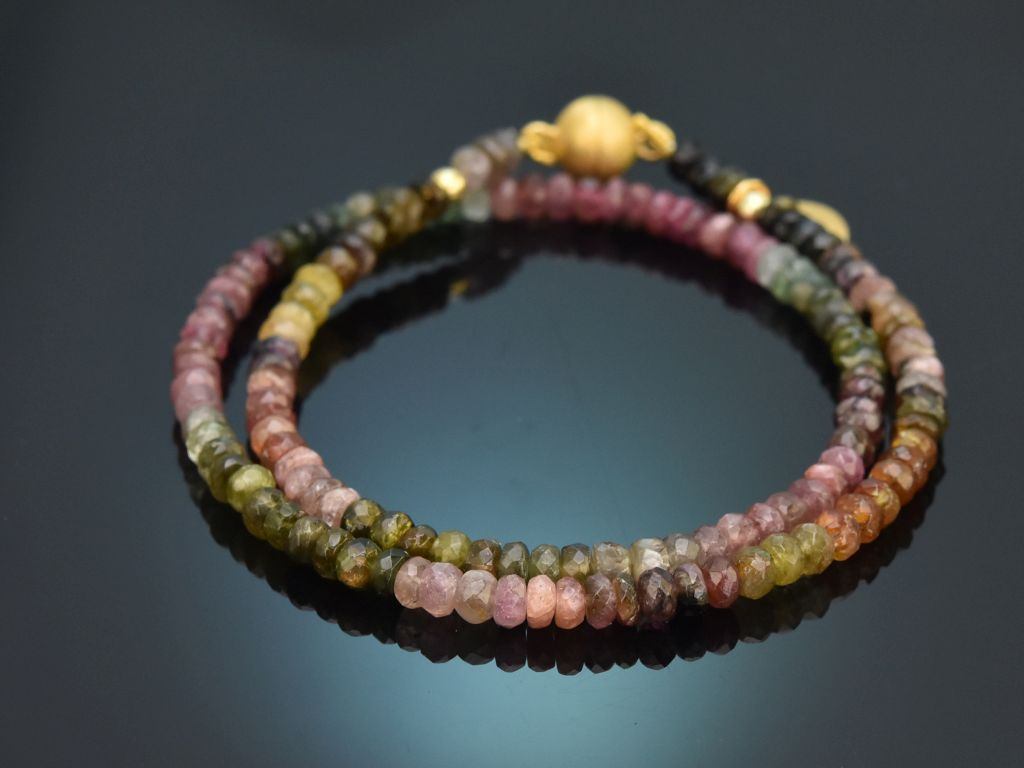 Das feine Armband wird zweireihig getragen und ist mit facettierten Turmalin-Linsen besetzt. Das breite natürliche Farbspektrum dieses Edelsteins kommt hier besonders gut zur Geltung: Von zartem Rosa über Hellgrün bis Dunkelgrün sind viele Varietäten des Turmalins verarbeitet. Zwei zarte Zierkugeln aus vergoldetem Silber setzten einen dezenten Akzent und passen gut zu der satinierten Magnetkugelschließe aus vergoldetem Silber.