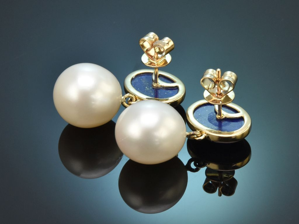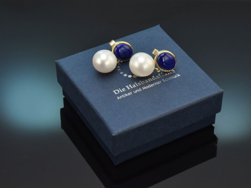 Schicke Ohrringe aus unserer Werkstatt, mit Lapislazuli und Zuchtperlen, gearbeitet aus Gelbgold 585 / 14 Kt (gestempelt und garantiert).