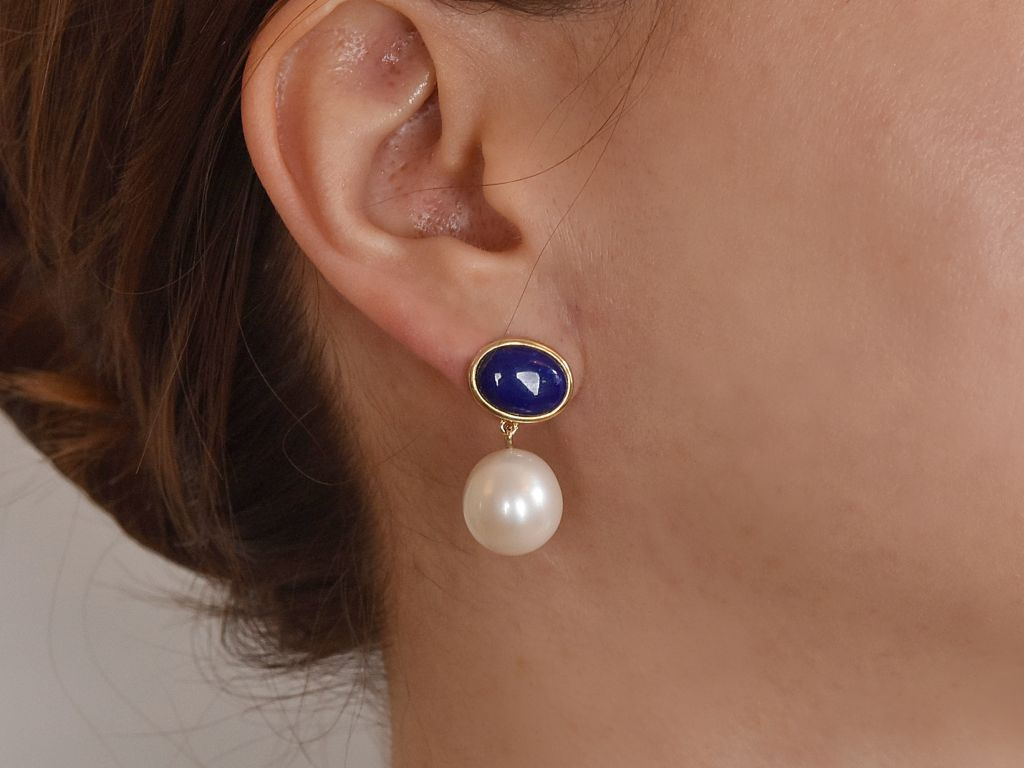 Die feinen und klassischen Ohrringe bestechen durch ihren wirkungsvollen Farbkontrast aus warmem Gold, dem intensiven Blau des Lapislazuli und dem schönen, schimmernden Weiß der Perlen. Sie wurden liebevoll in unserer Münchner Werkstatt in Handarbeit für Sie angefertigt und sehen vor allem zu maritimen Looks besonders hübsch aus.