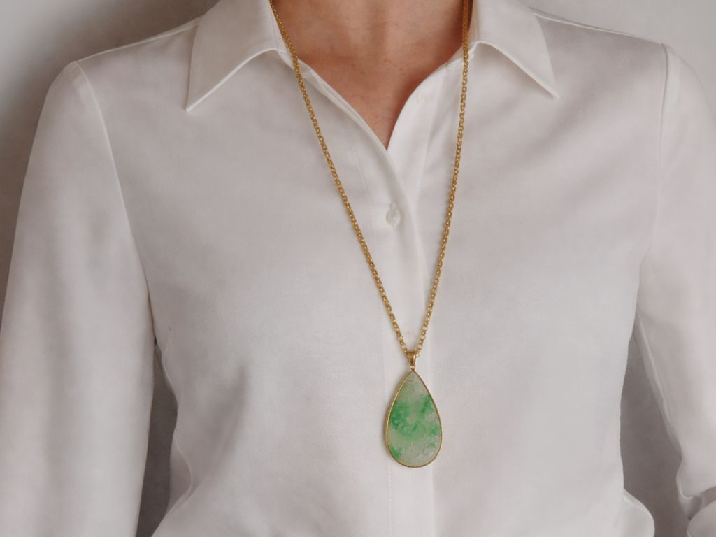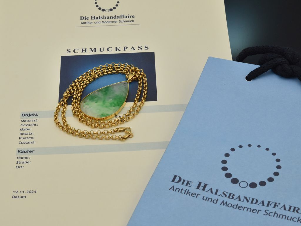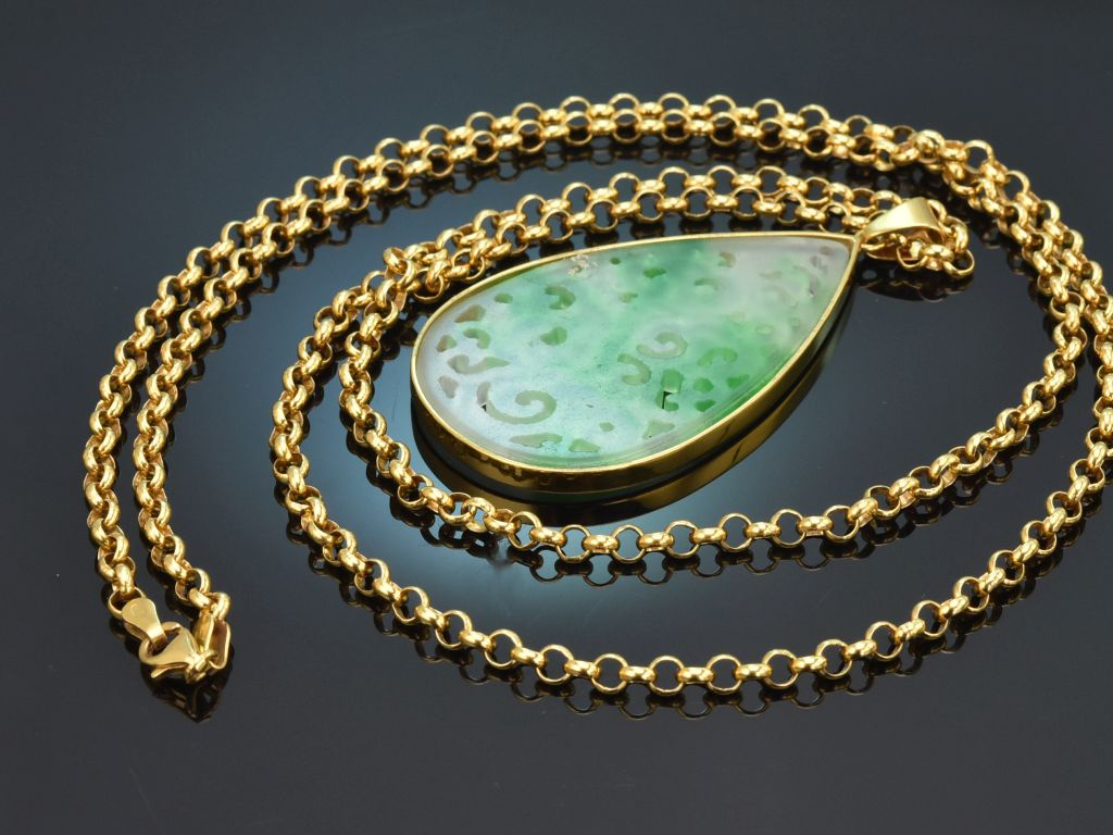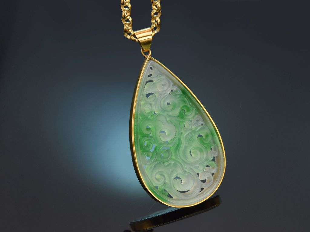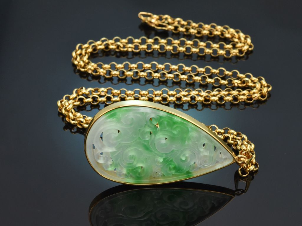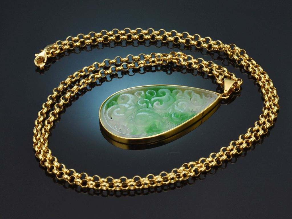 In den großen, tropfenförmigen Jadeit-Anhänger ist ein durchbrochenes, florales Muster geschnitten, das durch den interessanten Farbverlauf des Jadeit besonders lebhaft zur Geltung kommt. Der schöne Anhänger ist mit einer schlichten vergoldeten Silber Rahmung mit großer Anhängeröse versehen und hängt an einer langen Erbskette aus vergoldetem Silber.