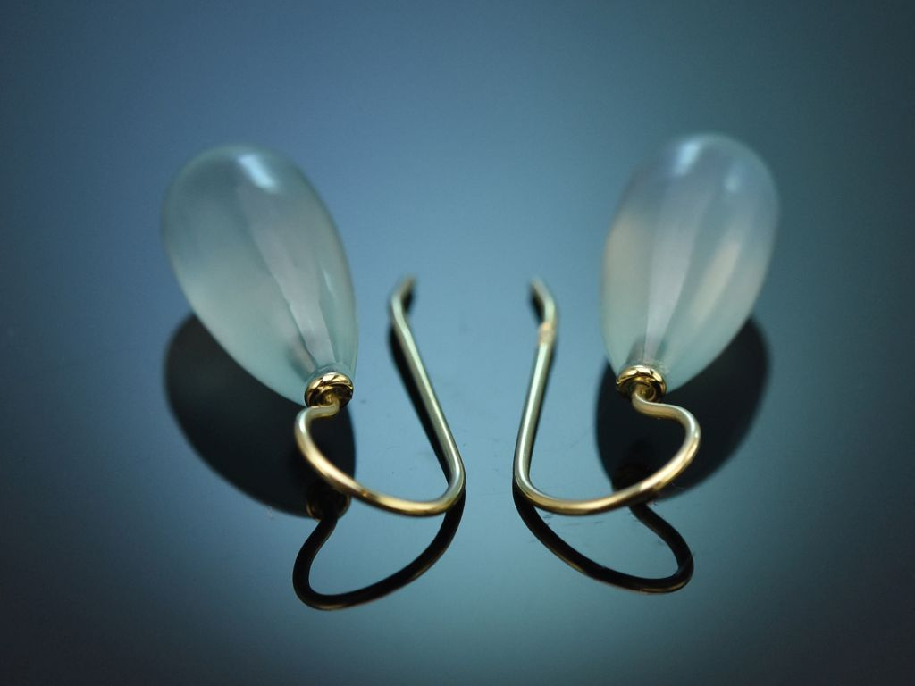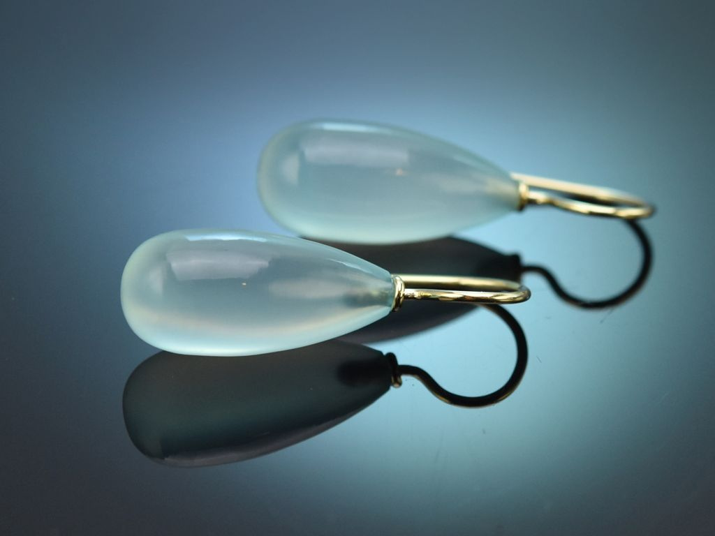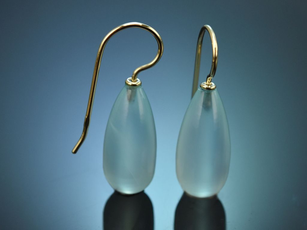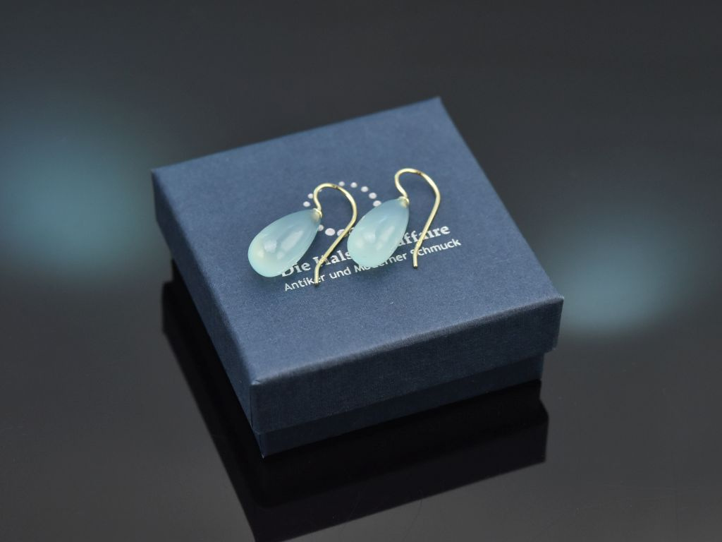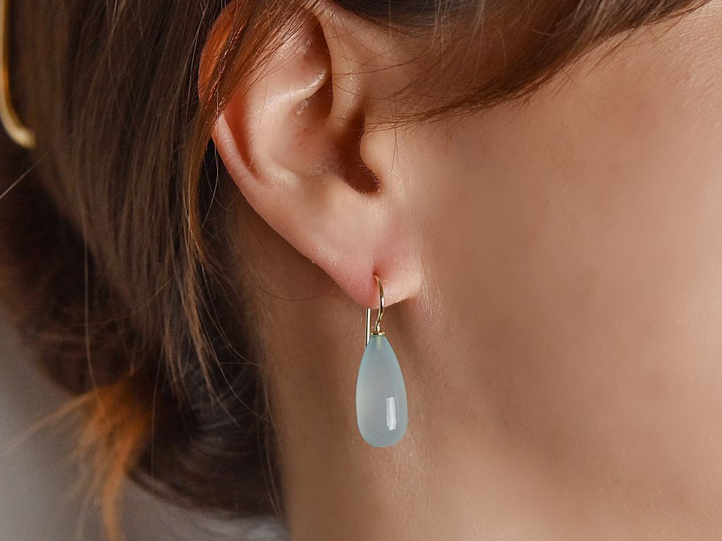 An handgeschmiedeten Hakenbrisuren aus Gelbgold sitzt jeweils ein schöner halbopaker Tropfen aus poliertem Chalzedon in einem feinen hellen Blau. Das sanfte Schimmern der Edelsteine harmoniert perfekt mit dem warmen Goldglanz der praktischen Brisuren.