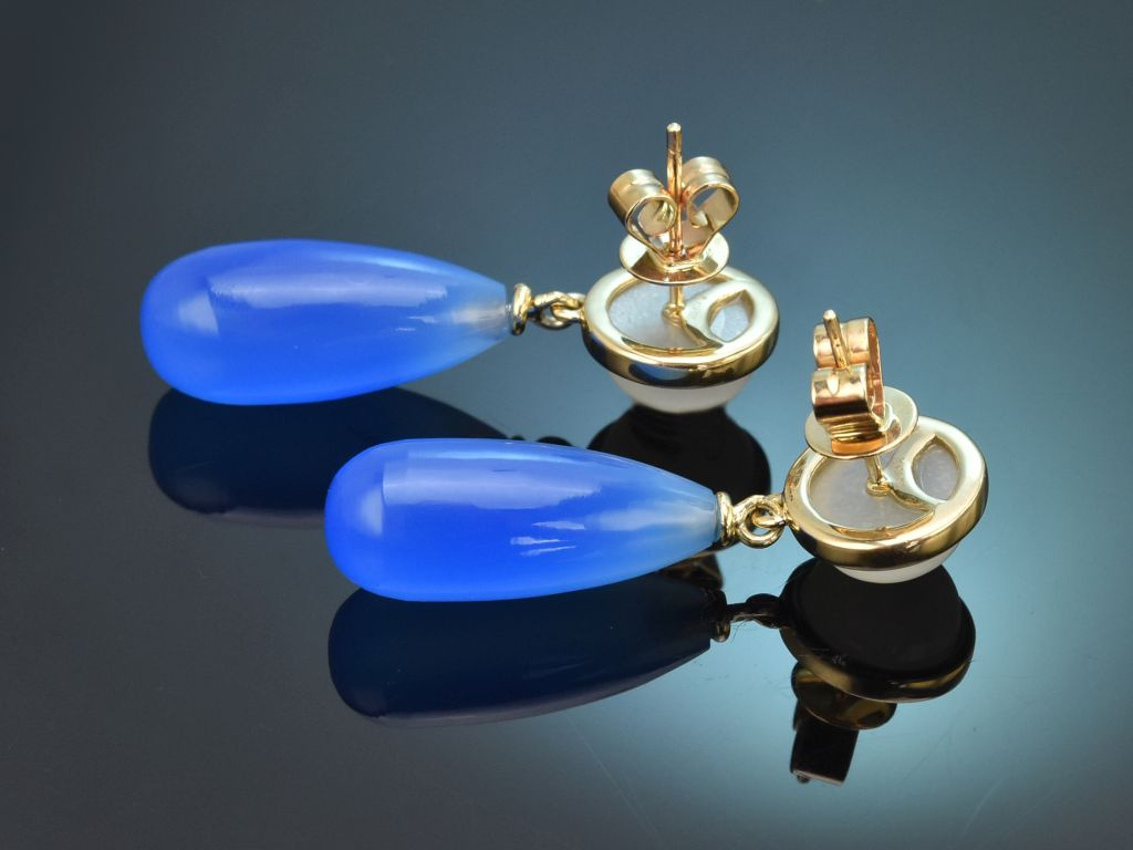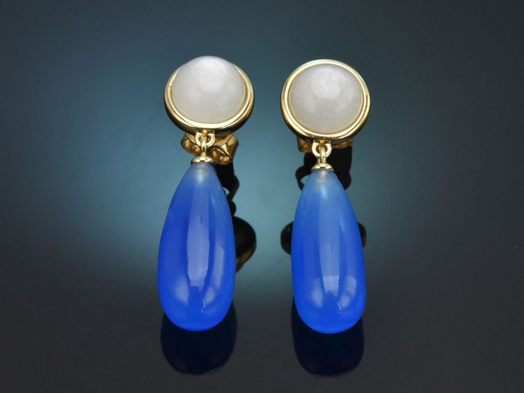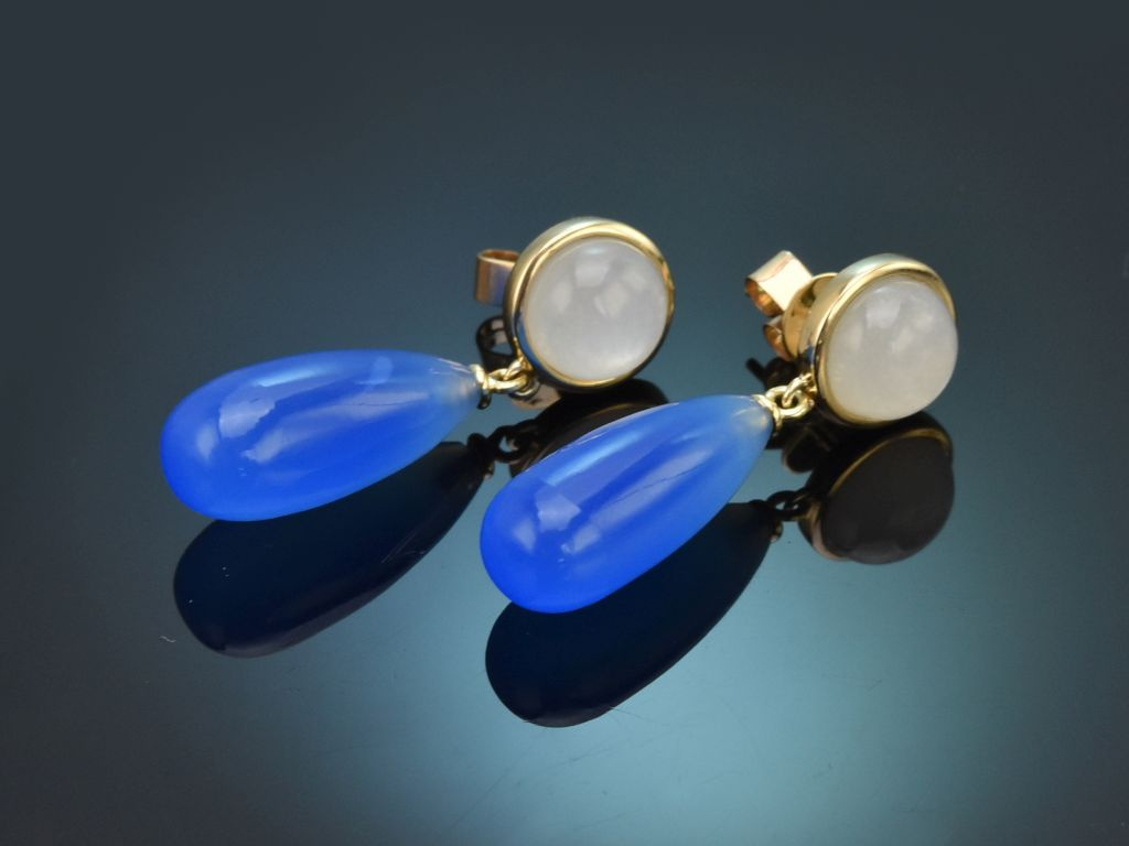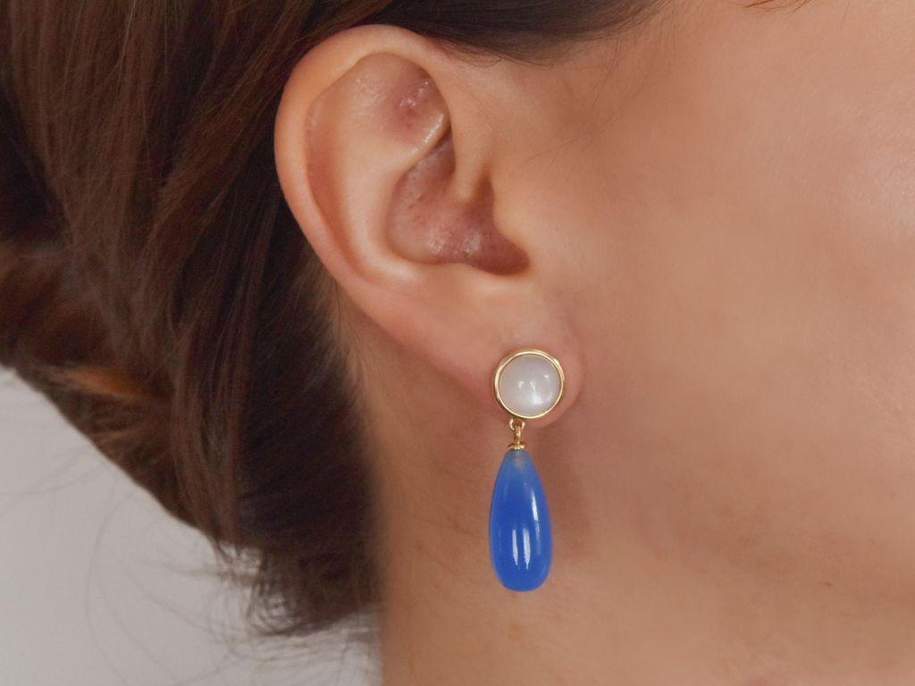 An runden Brisuren aus Gelbgold, die mit einem Mondstein-Cabochon besetzt sind, hängt jeweils ein länglicher Tropfen aus Blauachat. Der farbintensive Edelstein harmoniert besonders schön mit dem warmen Goldton der Fassung sowie mit dem schimmernden Mondstein und setzt einen feinen Farbakzent am Ohr.