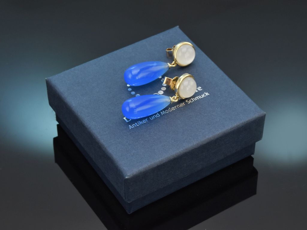 Besonders schöne Tropfen Ohrringe mit Mondstein und Achat, handgearbeitet in unserer Werkstatt aus Gelbgold 585/14 Kt (gestempelt und garantiert).
