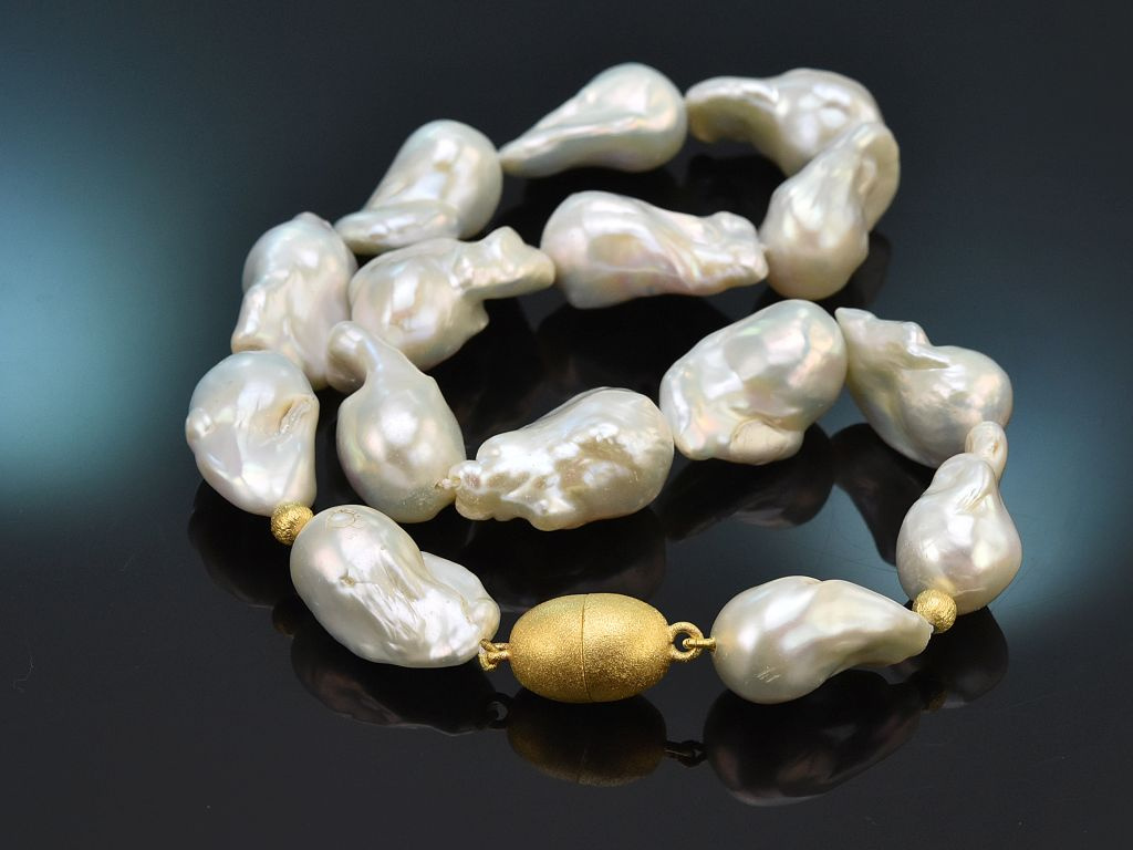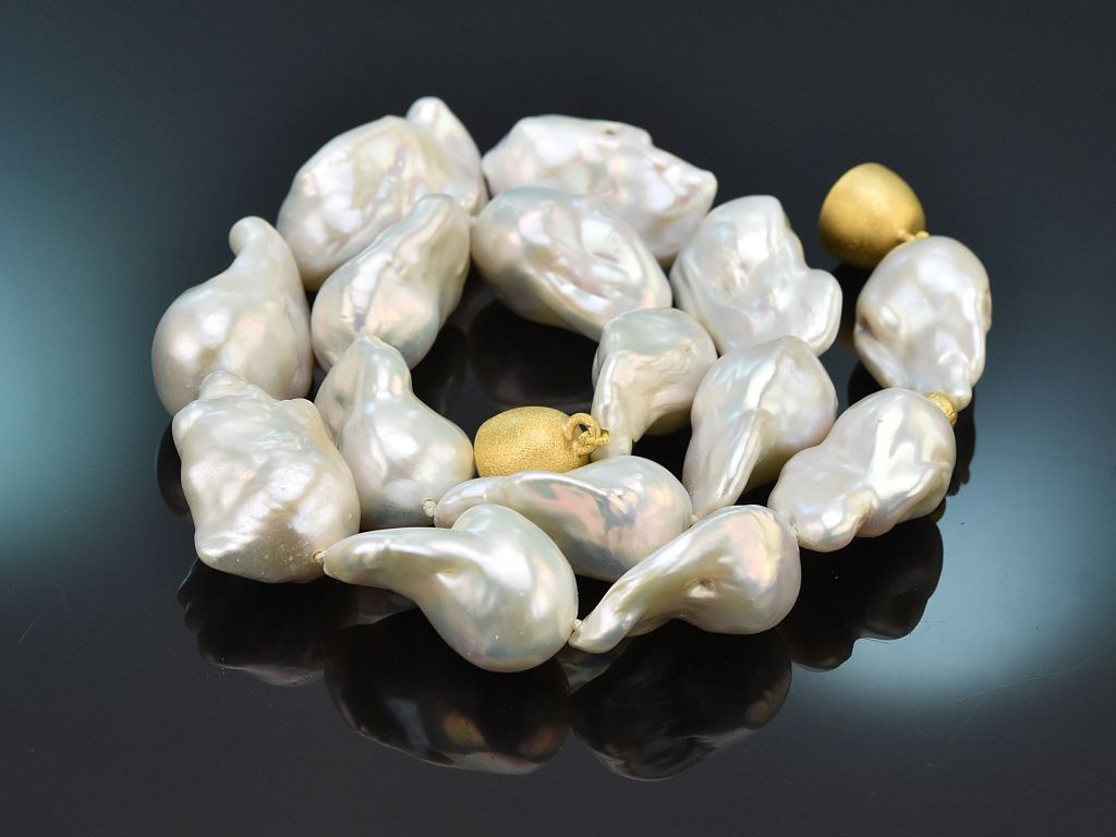 Die Kette besteht aus großen Barockperlen mit interessanten Wachstumsmerkmalen. Die Perlen haben einen lebhaften weißen Lüster, der durch die individuelle Form der Perlen besonders schön zur Geltung kommt.
