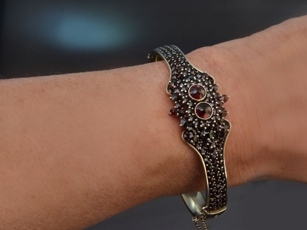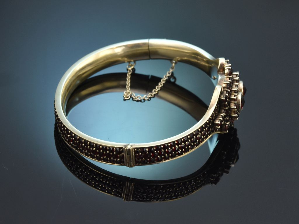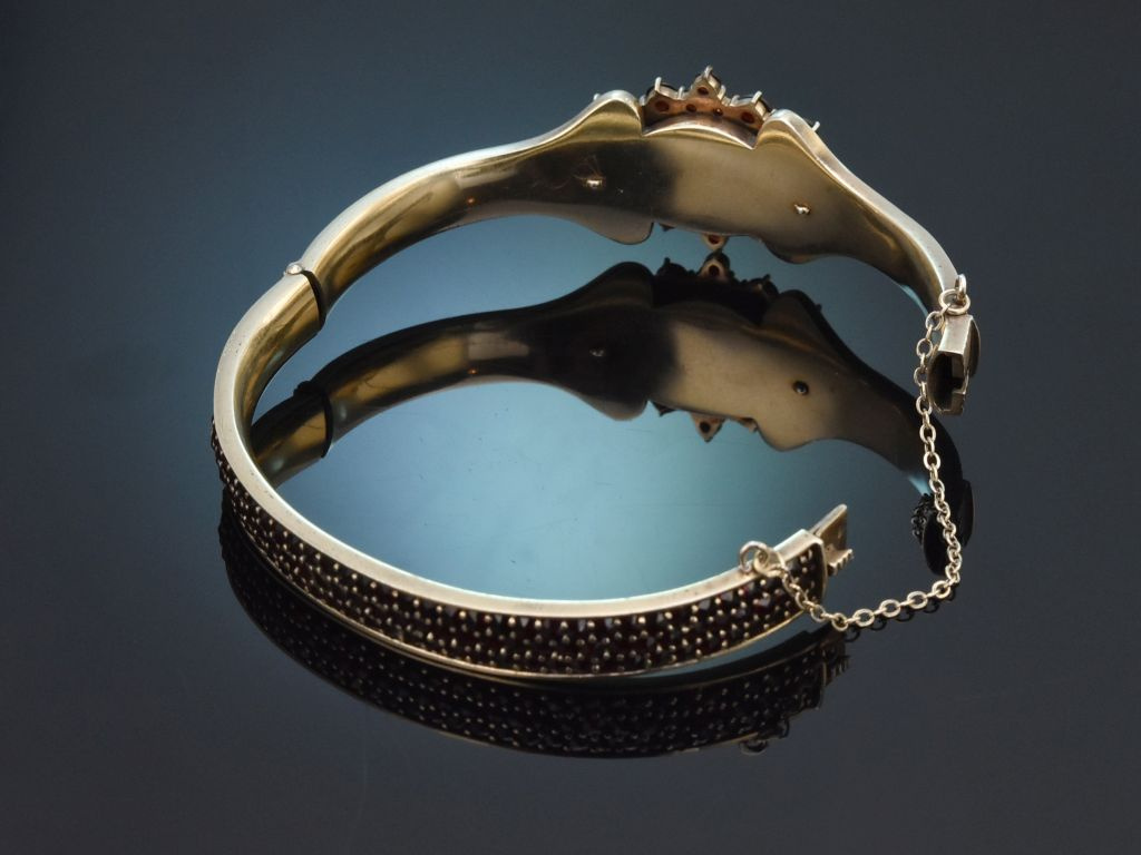 Der fein gearbeitete Armreif ist schauseitig mit einem hübschen, treppenförmig aufgebauten rosettenartigen Motiv versehen, das mit tiefroten Granatrosen besetzt ist. Die Armreifschiene ist ebenfalls reich mit drei Reihen feiner Granatrosen besetzt.