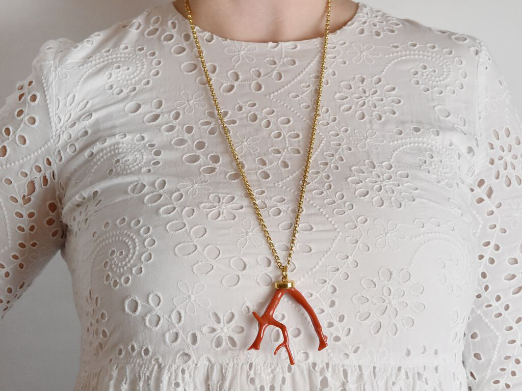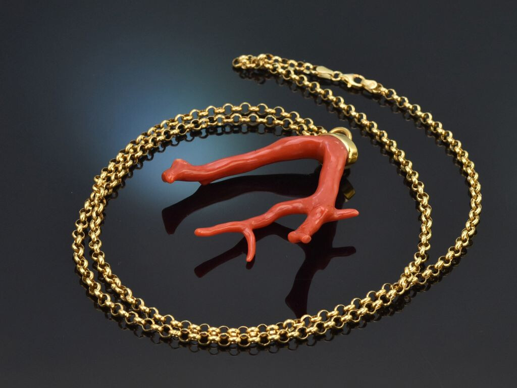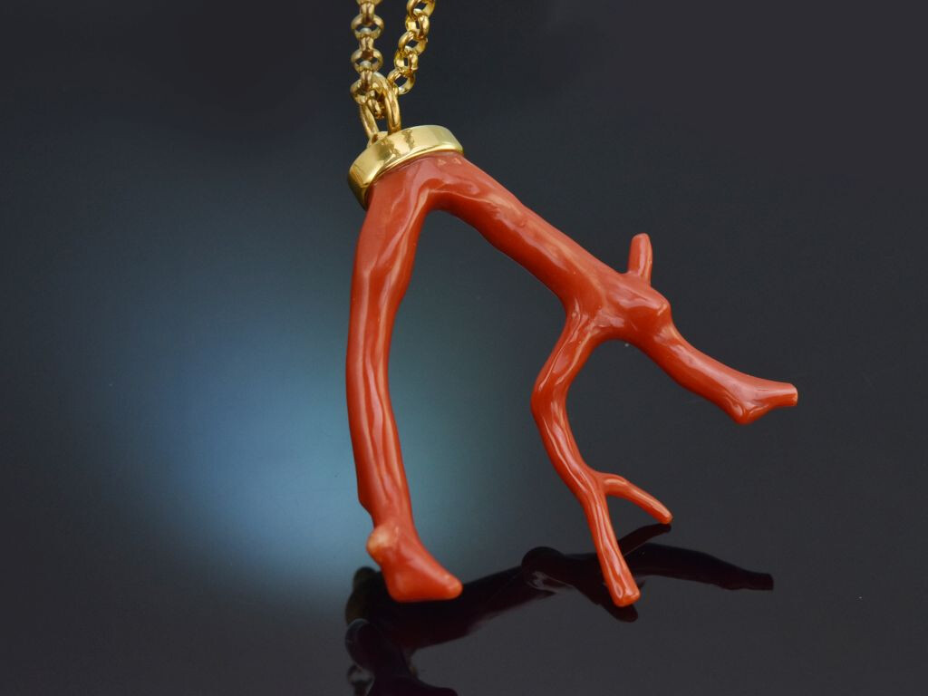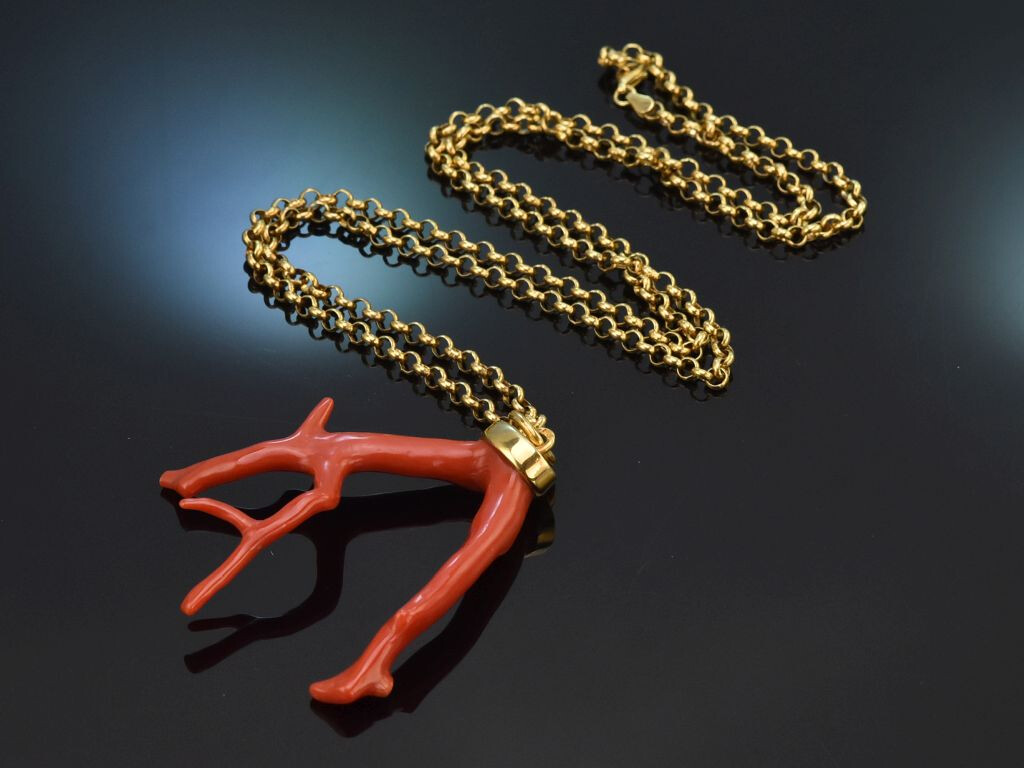 Großer Anhänger aus einer dicken italienischen Astkoralle mit langer Kette aus vergoldetem Sterlingsilber 925 (gestempelt und garantiert).