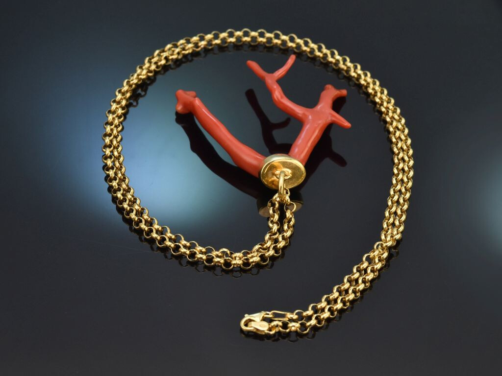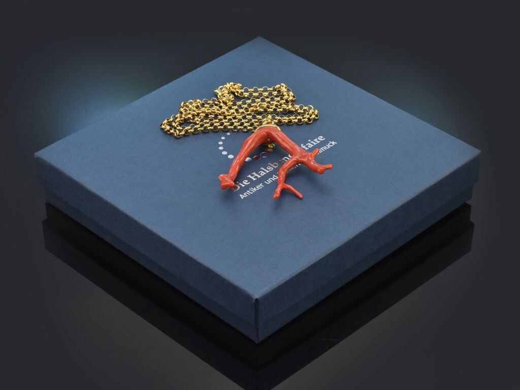Der schöne Anhänger besteht aus echter, natürlich gewachsener und massiver Mittelmeer-Koralle von unserem Korallenhändler aus Torre del Greco, die in unserer Münchner Werkstatt von Hand in vergoldetem Sterlingsilber gefasst wurde. Der Anhänger besticht durch seine imposante Größe, sein sattes, glänzendes Rot sowie die aparte organische Form. Er sitzt an einer langen Kette in kräftigem Erbsmuster aus vergoldetem Sterlingsilber, die mit einem schlichten Karabinerverschluss ausgestattet ist.
