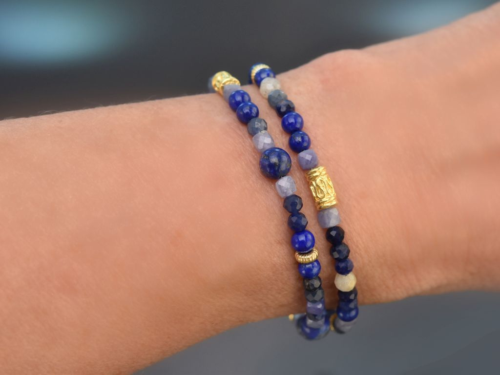 Dieses zweireihig getragene Edelsteinarmband begeistert mit intensiven Blautönen und einer harmonischen Komposition aus facettierten Edelsteinkügelchen. Kleine vergoldete Zierelemente aus Silber 925 sind dazwischen eingefasst und setzen feine, edle Glanzakzente.
