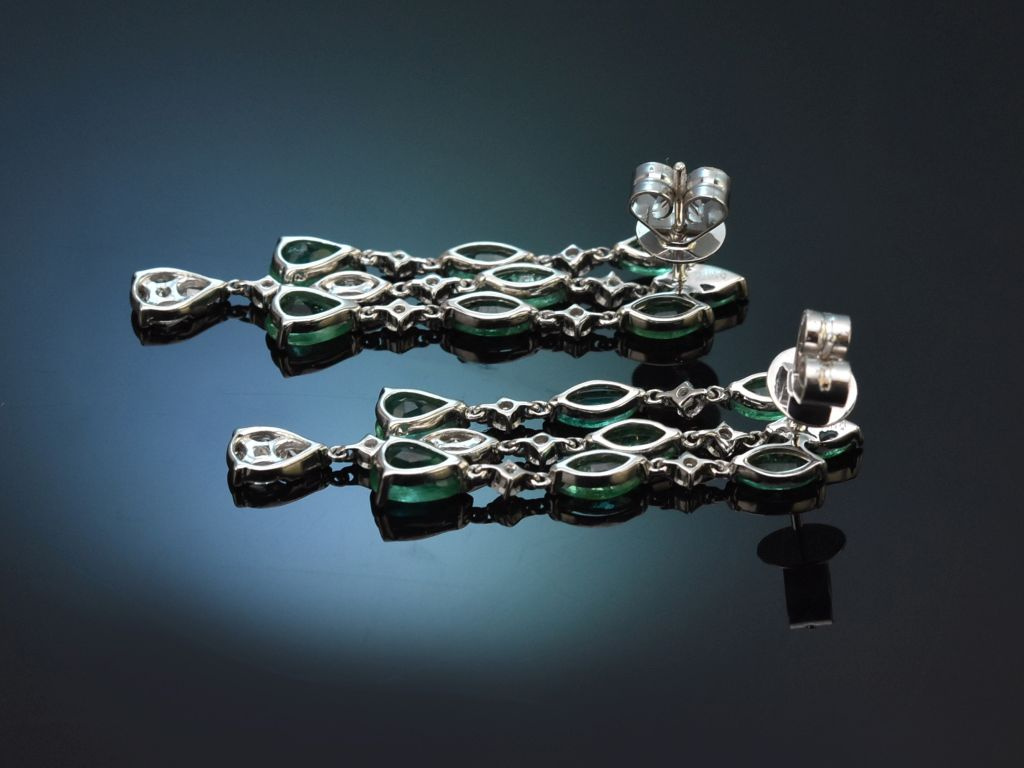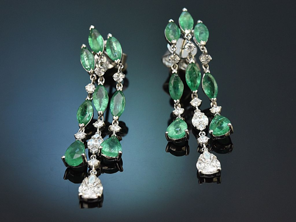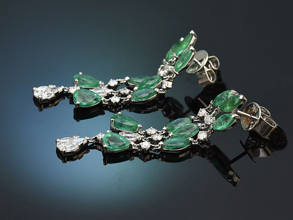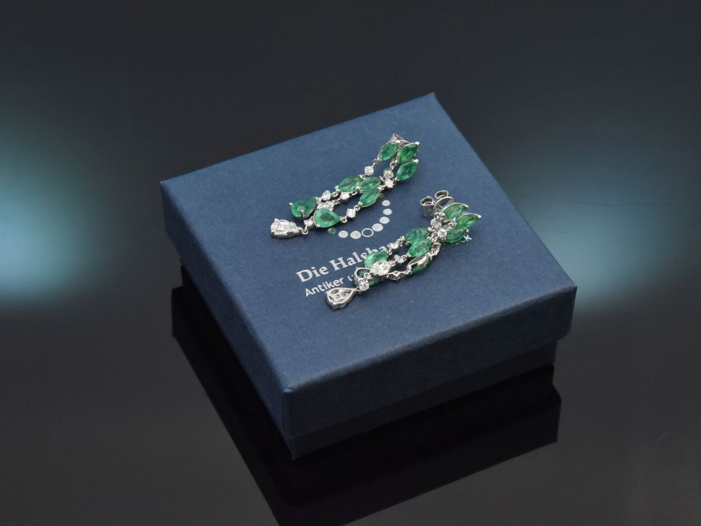 Hochwertige und festliche Smaragd Ohrringe mit Diamanten, gearbeitet aus Weißgold 750 / 18 Kt (gestempelt und garantiert).