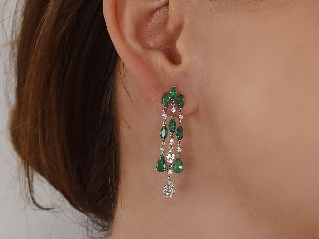 Die eleganten Ohrringe bestehen aus je drei juwelenbesetzten Strängen, die frei beweglich an den klassischen Steckbrisuren pendeln. Sie sind mit je acht Smaragden in Navette- und Tropfenschliff besetzt, dazwischen funkeln je 16 Diamanten in Princess-, Navett-, Brillant- und Tropfenschliff, die den Ohrringen eine edle funkelnde Note geben.