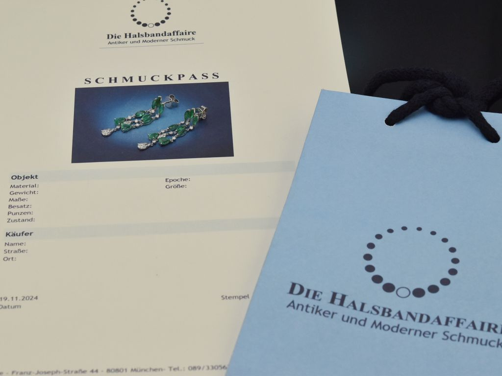 Die feinen Smaragde haben ein Gewicht von zus. 3,60 Carat. Die insgesamt 32 Diamanten liegen im schönen Qualitätsbereich (G-H, VS1-SI1) und haben ein Steingewicht von zus. 0,86 Carat.