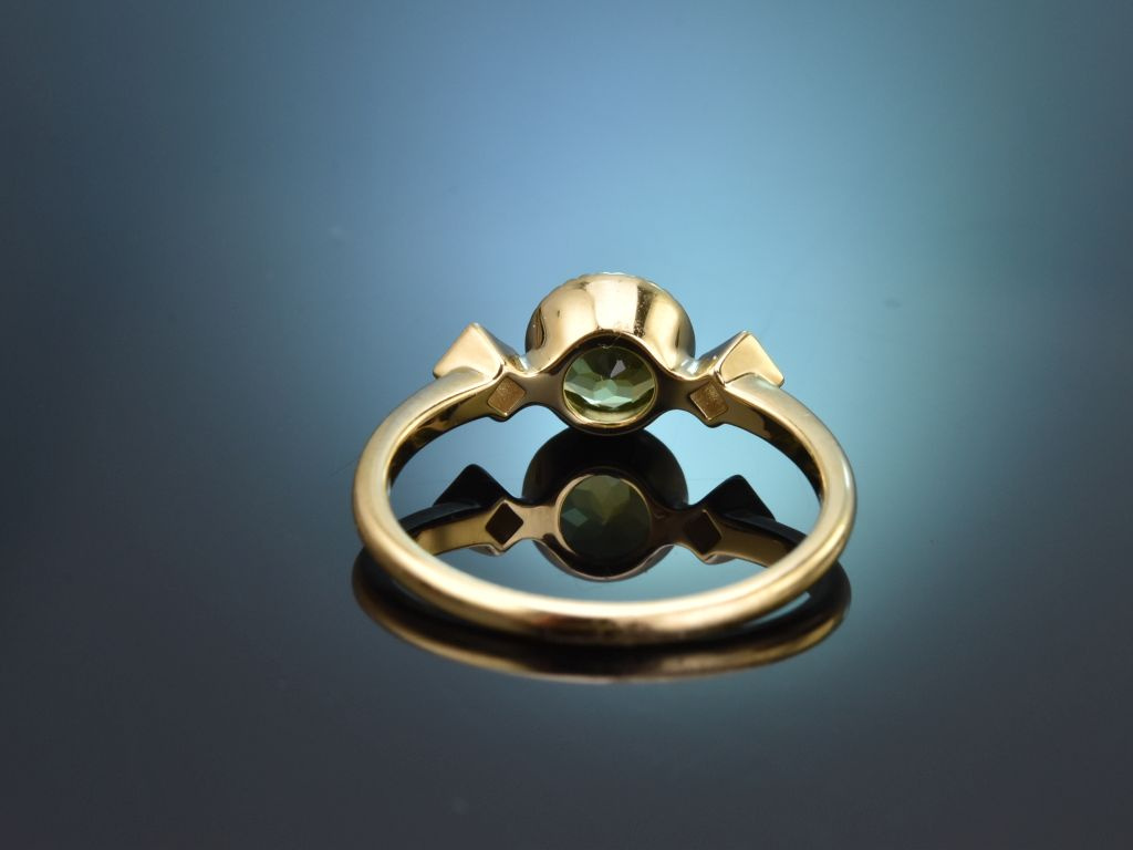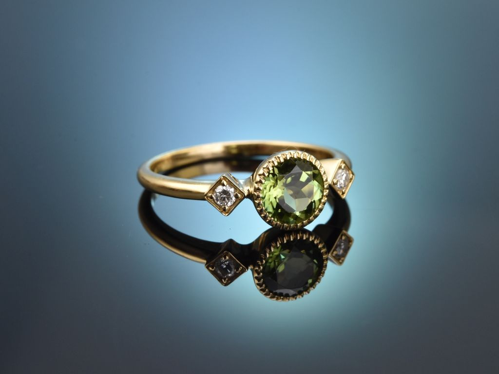 Der Ringkopf ist mittig mit einem apfelgrünen Peridot in rundem Facettenschliff besetzt. Der funkelnde Farbstein von 0,90 Carat wird von zwei rautenförmig gefassten Diamanten in Brillantschliff flankiert. Die Brillanten liegen im schönen Qualitätsbereich (G, VS2-SI1) und haben ein Steingewicht von zus. 0,08 Carat.