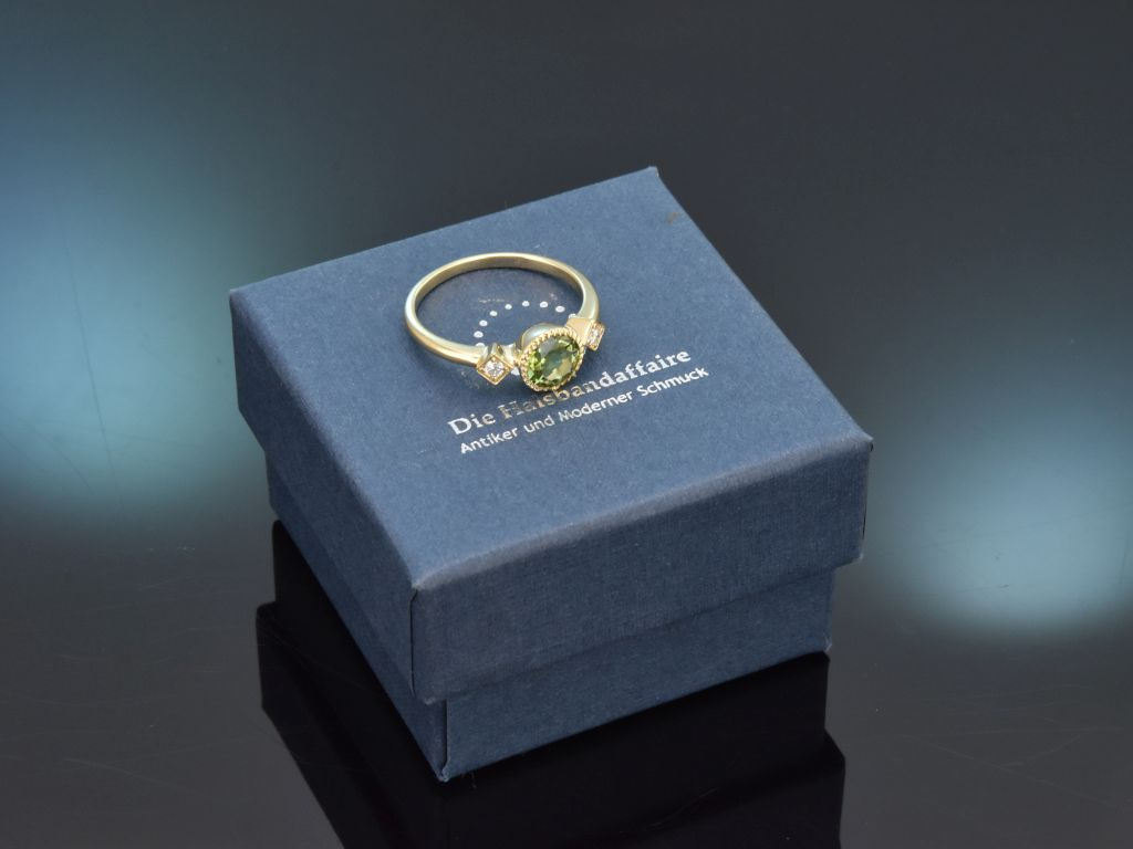 Edler Ring mit leuchtendem Peridot und Brillanten, gearbeitet aus Gelbgold 585 / 14 Kt ( gestempelt und garantiert).