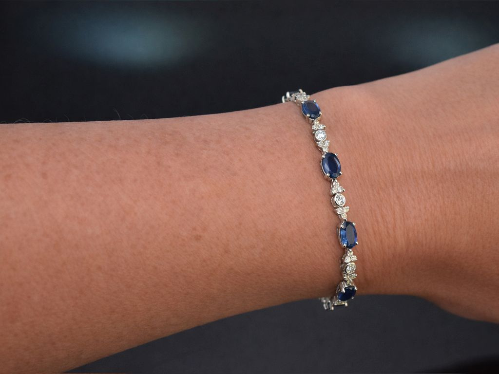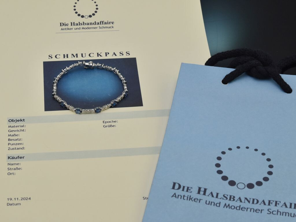 In diesem zeitlosen Entwurf wechseln sich feine blaue Saphire in facettiertem Ovalschliff und dazwischen jeweils sieben funkelnde Diamanten in Brillantschliff ab. Die insgesamt zwölf Saphire haben ein Steingewicht von zus. 5,2 Carat und einen intensiven, leuchtenden Blauton.