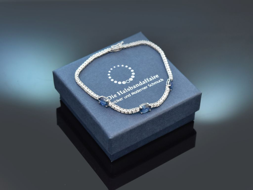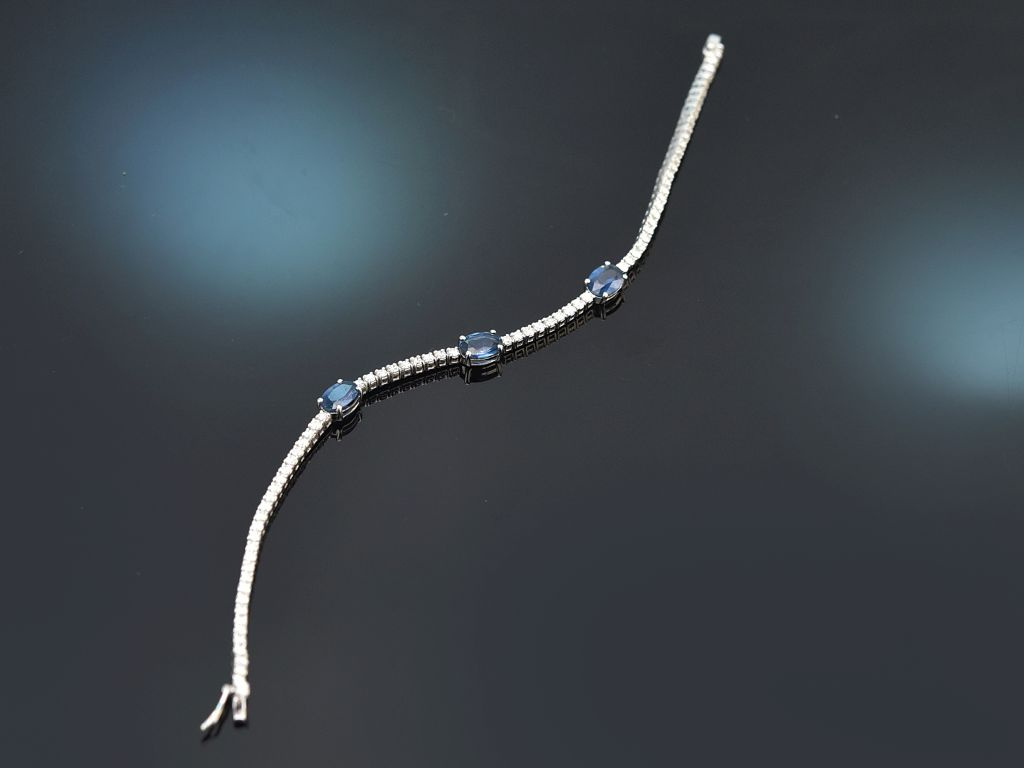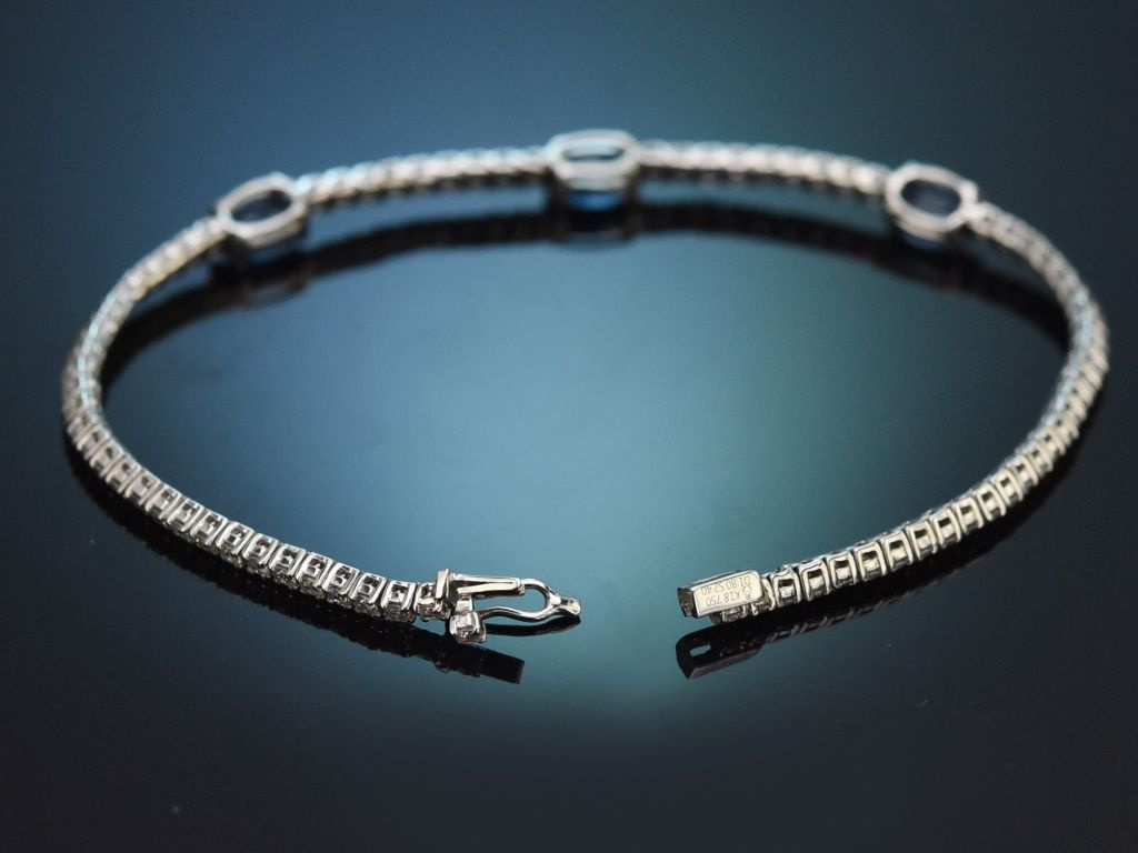 Das elegante Armband besteht umlaufend aus einer Reihe von 76 Diamanten in Brillantschliff, die mittig von drei feinen Saphiren in Ovalschliff akzentuiert werden. Die Brillanten haben ein Steingewicht von zus. 1,8 Carat und sind von schöner Qualität (G-H, SI1-SI2), die drei krappengefassten Saphire haben ein Gewicht von zus. 2,4 Carat und bestechen durch ihr feines, leuchtendes Königsblau.