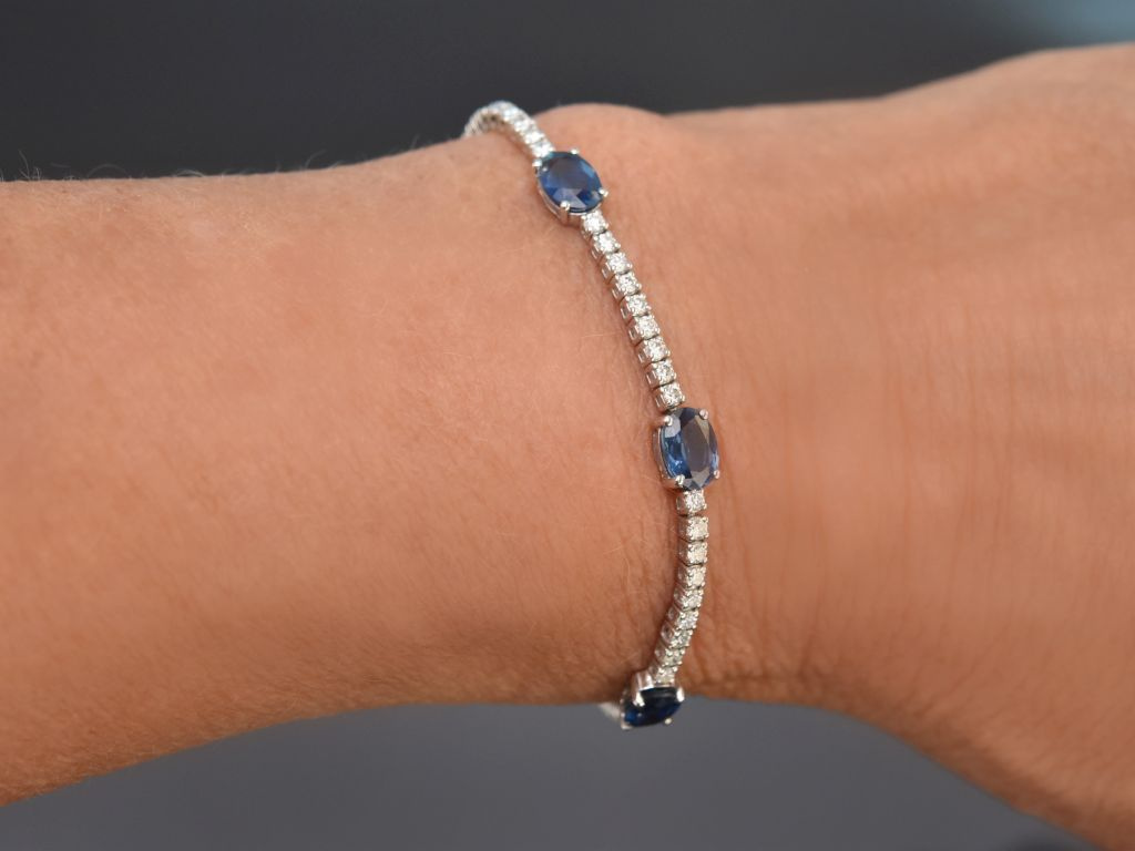 Hochwertiges und zeitloses Rivière Armband mit Saphiren und Brillanten, gearbeitet aus Weißgold 750 / 18 Kt (gestempelt und garantiert).