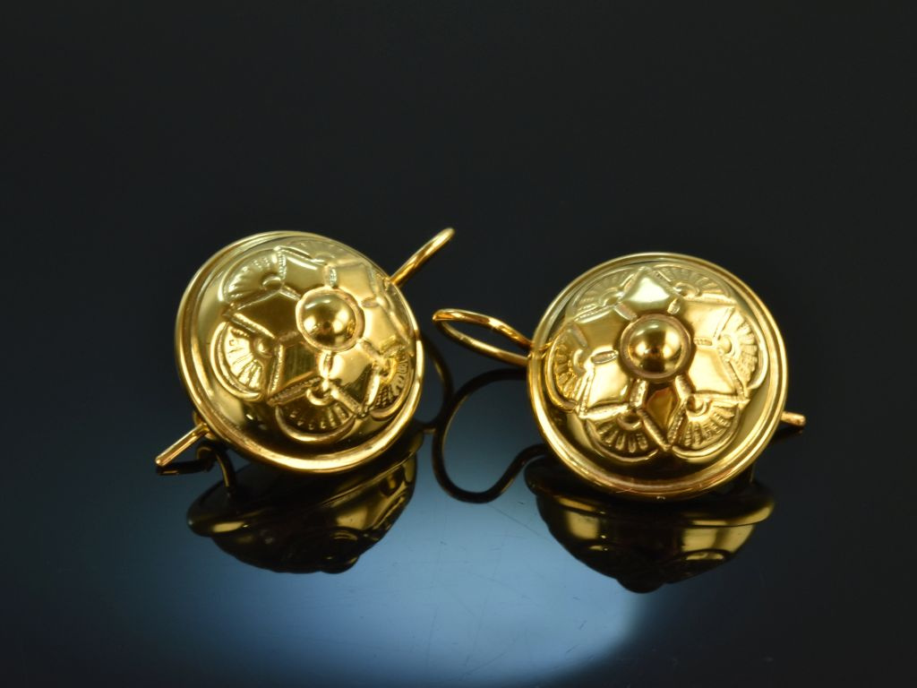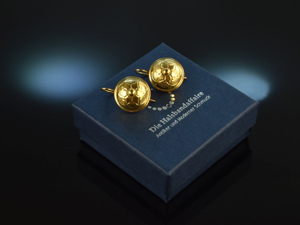 Separate pair of historical earrings from around 1930, made of gold-plated silver 835 stamped and guaranteed. The former buttons were reworked by our goldsmith as earrings. The beautiful earrings are decorated with deepened discs with a geometric star ornament. On the back of the earrings have solid hooked bristles which can be closed by a small bow.