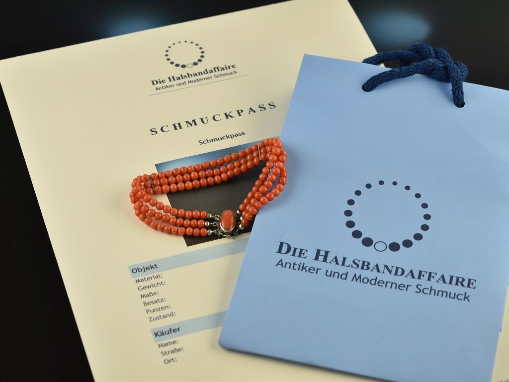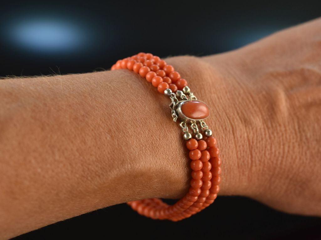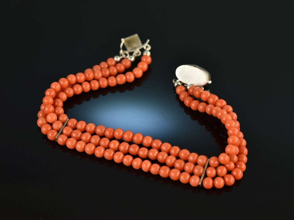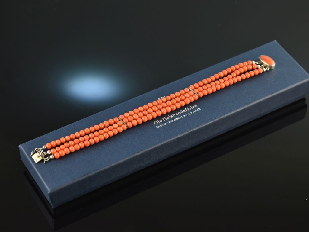 The fine Italian Sardegna coral beads with a wonderfully even surface as well as a beautiful salmon-colored red hue are strung inandnbsp;three strands. The bracelet is closed with a securely functioning box clasp set with an oval cabochon cut coral.