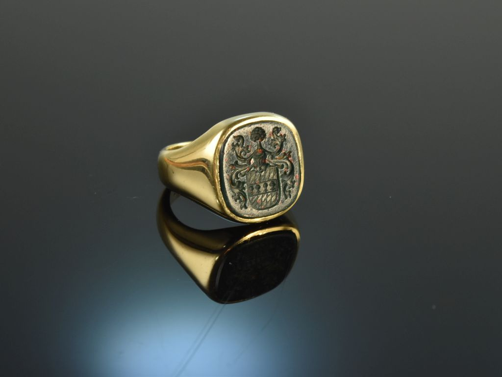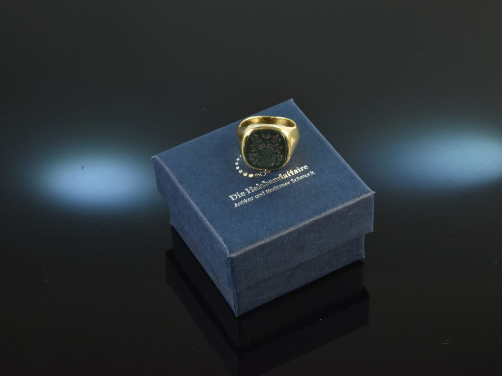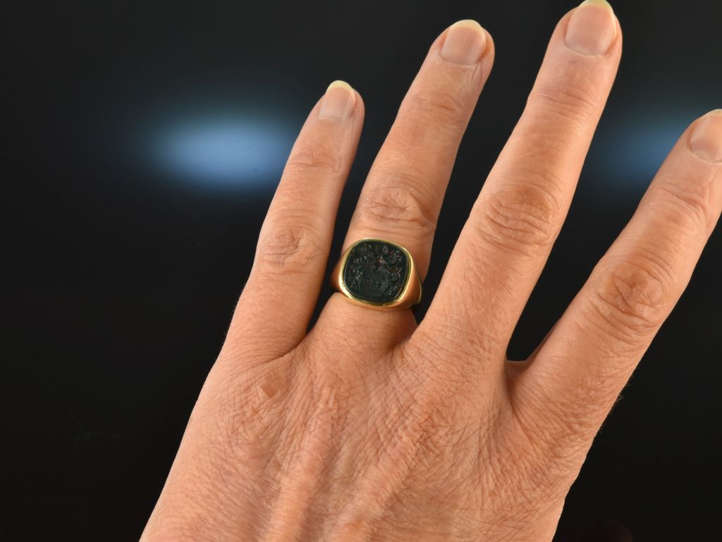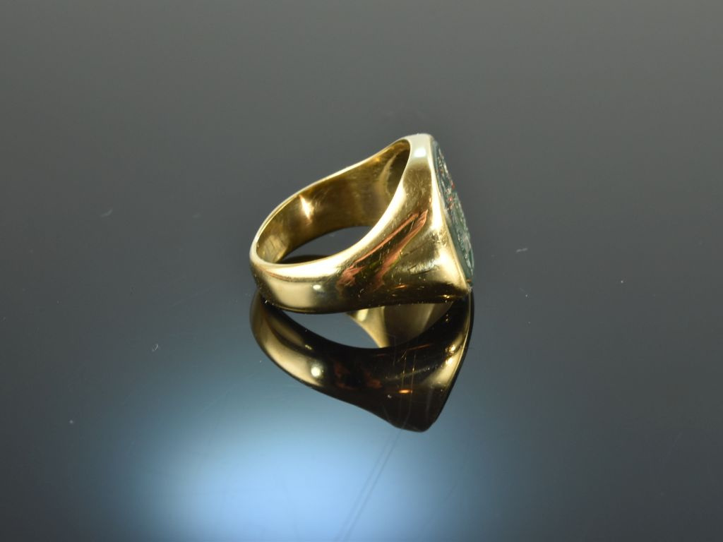 Classic signet ring / coat of arms ring made of yellow gold 585 / 14 Kt (stamped and guaranteed) with an engraved blood jasper disc in characteristic dark green with red inclusions.