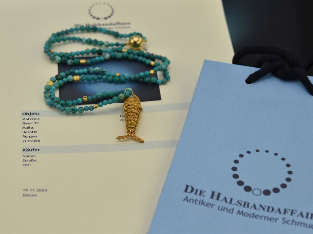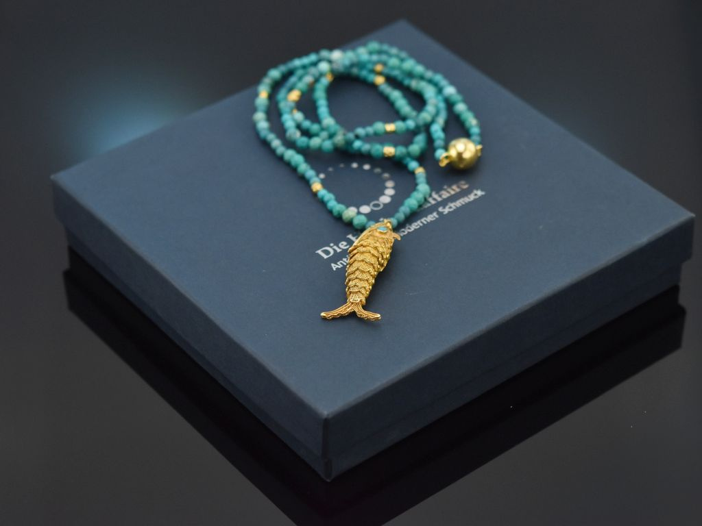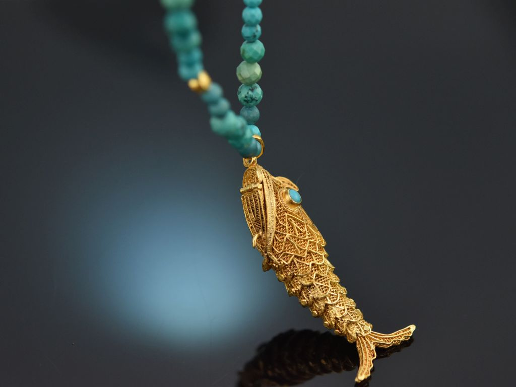 The detailed pendant in the shape of a fish consists of individually mounted filigree links and is therefore wonderfully flexible. Its eyes are accentuated by two cabochon-cut turquoises. The fish's mouth can be opened using a small lever and has a secret compartment in which small keepsakes can be stored.
