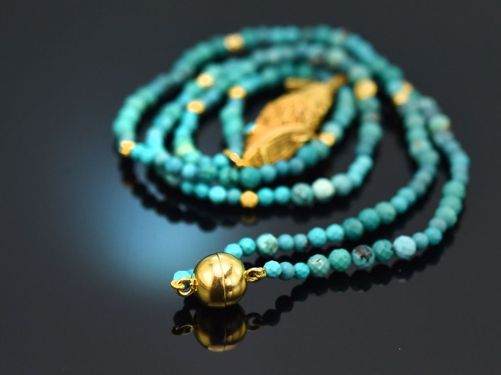The long chain with a magnetic ball clasp on the back was newly added in our workshop and consists of polished and faceted turquoise beads, between which fine decorative beads of gold-plated sterling silver are incorporated.