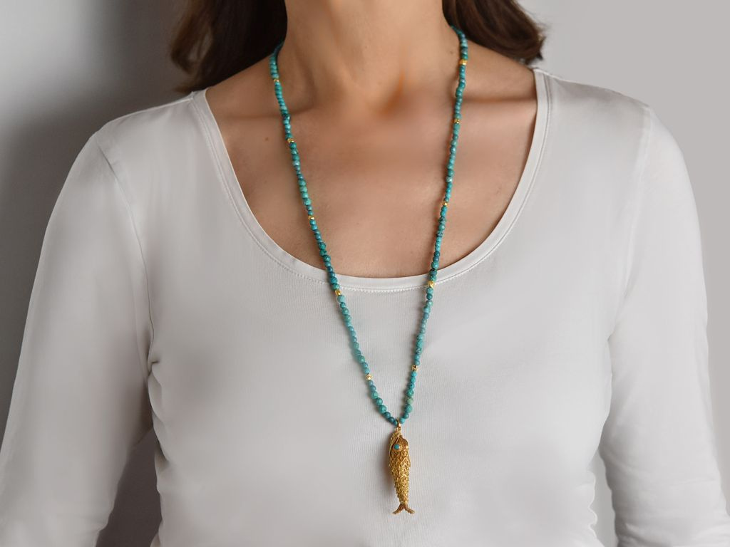 Filigree vintage fish pendant with long turquoise chain, crafted from gold-plated silver (stamped and guaranteed).