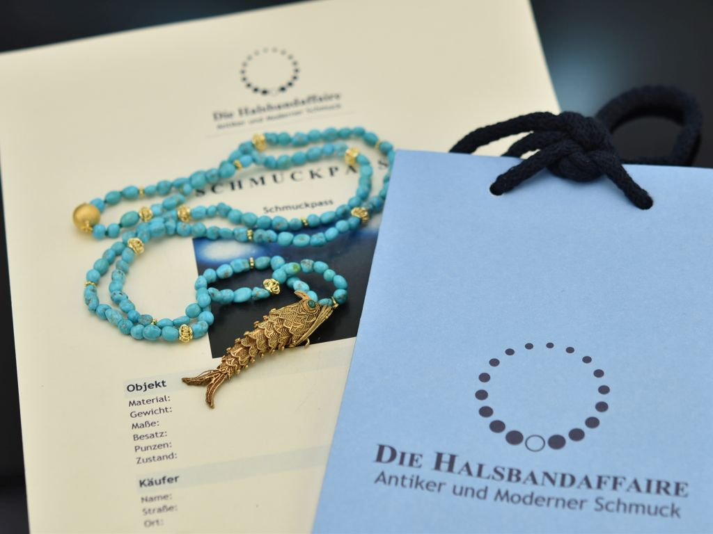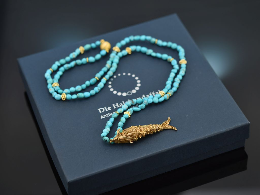 The detailed pendant in the shape of a fish consists of individually mounted filigree links and is therefore wonderfully flexible. Its eyes are accentuated by two cabochon-cut turquoises. The fish's mouth can be opened using a small lever and has a secret compartment in which small keepsakes can be stored.