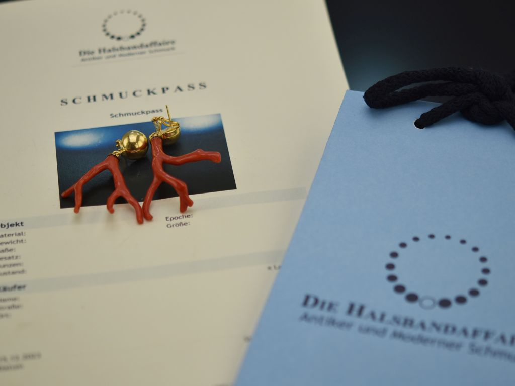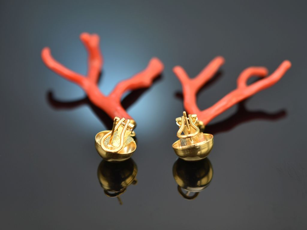 A beautiful Sardegna coral branch hangs from each of the large, hemispherical stud earrings. The naturally grown Italian corals impress with their wonderful, even red color and the extremely beautiful surface quality.
