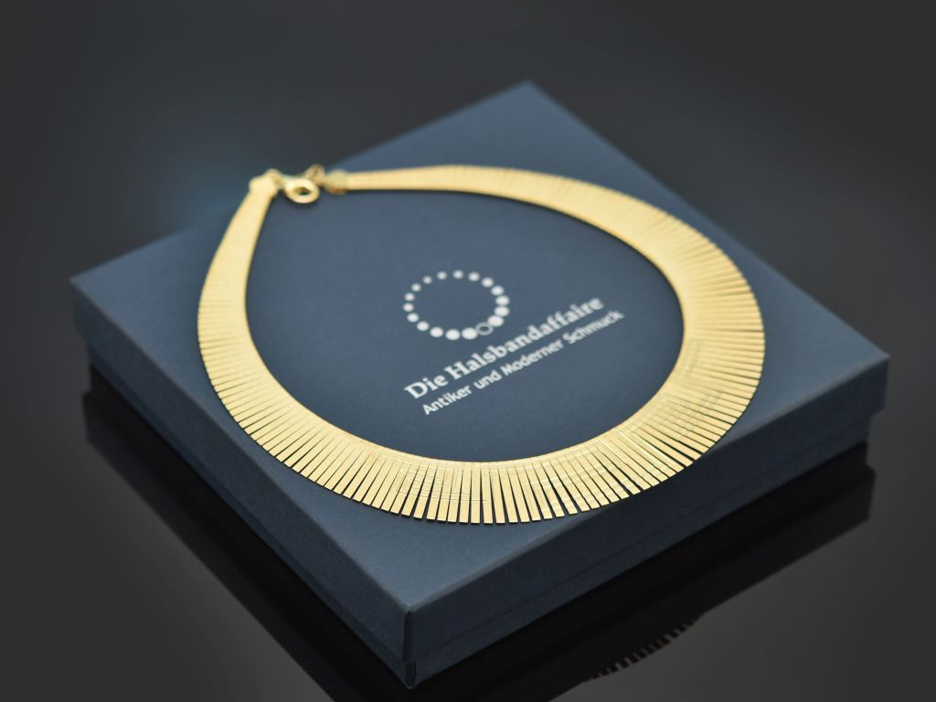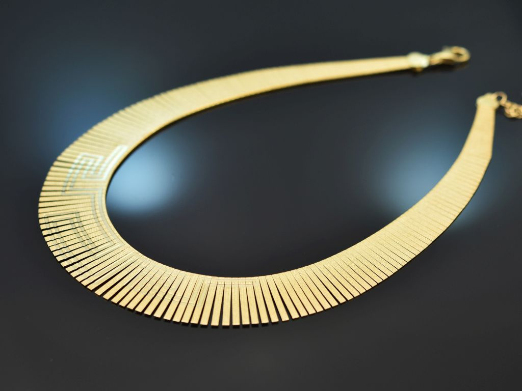 The necklace consists of fine, radiant links that are arranged in a flexible pattern. The necklace has a silky matt shaded finish and a meander pattern running down the centre. The necklace is fastened with a lobster clasp and can be adjusted in length with an extension chain.