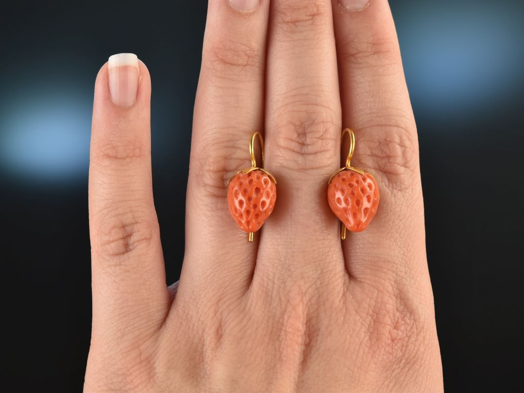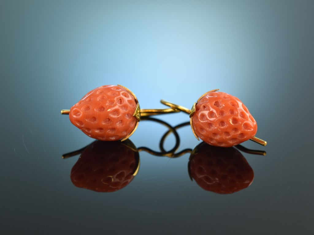 Wonderful pair of strawberry earrings with brissure in gold-plated sterling silver 925 (stamped and guaranteed). The strawberries of this delightful ear ornament are each made of an exquisite, plastically cut Mediterranean coral. The high-quality handcrafted earrings swing charmingly and safely on the ear due to their hook brissure.