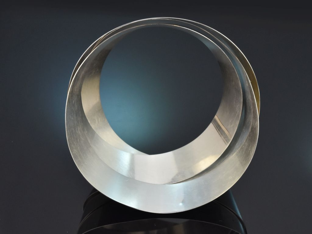 This extraordinary piece of designer jewellery is forged from a wide ring of sterling silver, which is put under tension until it springs into a three-dimensional shape of its own accord. This creates a hoop that appears to consist of moving, intertwined circles - like a spiral that can be pulled apart but always returns to its original shape.