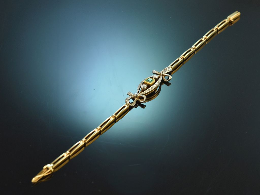 The bracelet consists of gold bar links that merge into a striking centre section with platinum plating. Filigree openwork and period-typical bow motifs are set with numerous small rose-cut diamonds and complemented by four larger old-european-cut diamonds. The diamonds have a total weight of ca. 0.58 carats and are of beautiful quality (H-I, SI1-SI2).