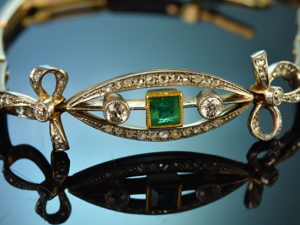 A stunning historical bracelet from the Belle Époque period, set with an emerald and diamonds, crafted from platinum and 585/14 carat yellow gold (tested and guaranteed).
