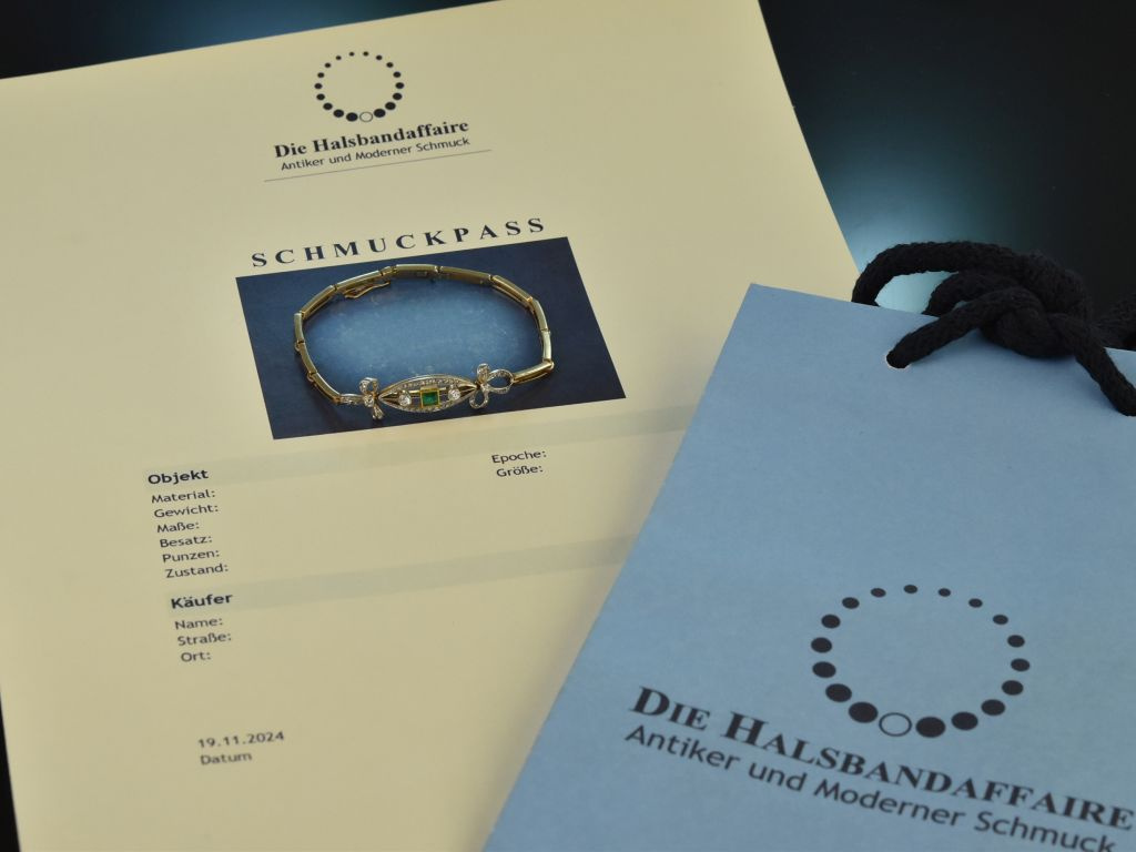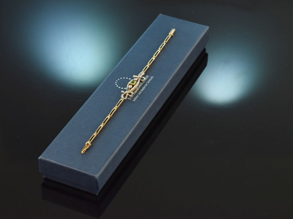 At the centre of the motif sits a fine, bright green square-cut emerald weighing ca. 0.24 carats. Set in gold, the coloured stone forms a beautiful contrast to the platinum-set diamonds and at the same time creates a harmonious connection to the rest of the bracelet.