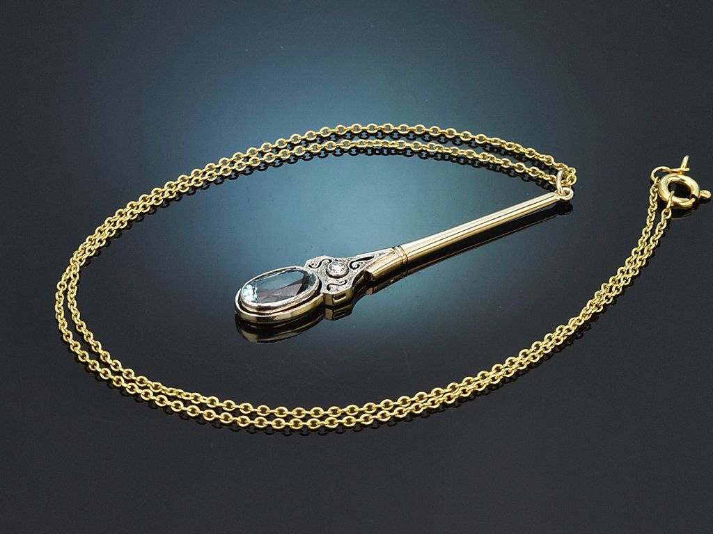The elegant pendant, in a slender teardrop shape, is crafted from 585/14 carat yellow gold (hallmarked and guaranteed) and features a fine platinum overlay on the front. It is set with a fine sky-blue oval-cut aquamarine of ca. 1.8 carats and a step-cut diamond of ca. 0.04 carats (G-H, VS1-VS2). These gemstones are elegantly framed in a style typical of the period, featuring fine openwork and millegrain decoration.