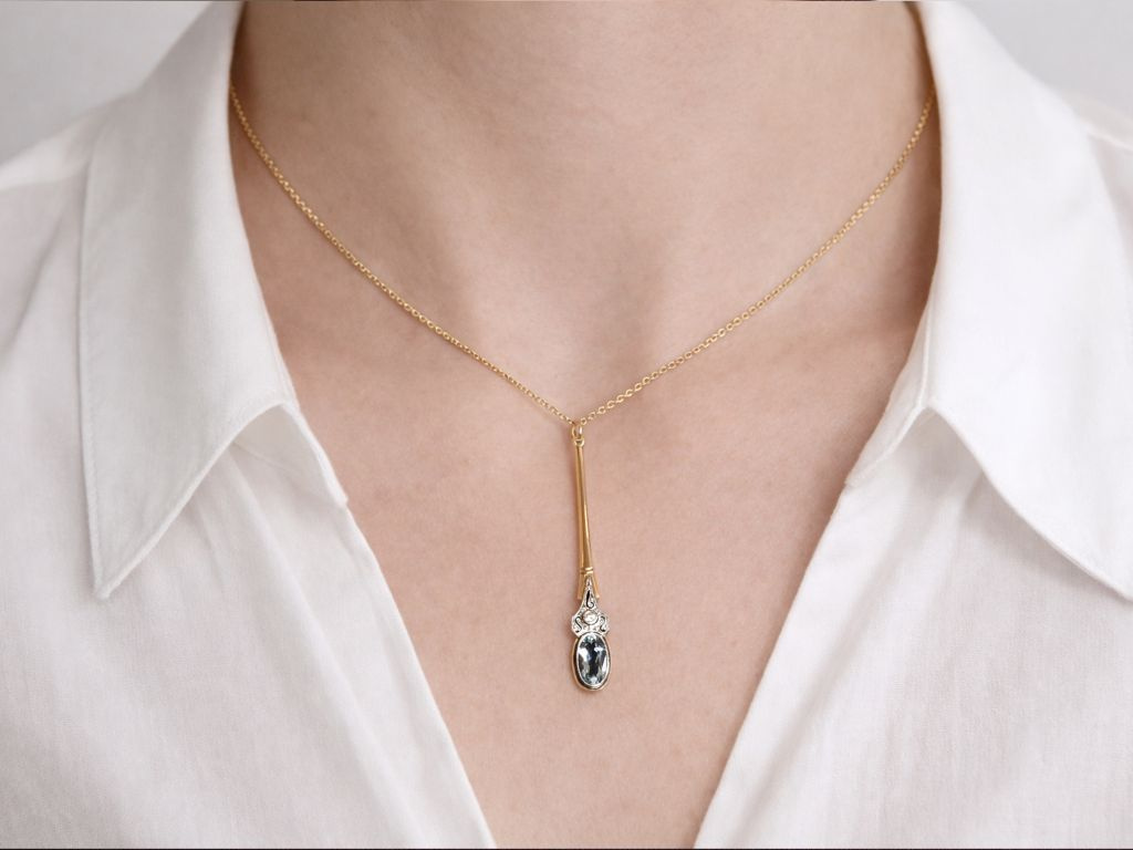 Antique pendant necklace featuring an aquamarine and diamond set in 585/14-carat yellow gold and platinum, with a chain in 333/8-carat gold (hallmarked and guaranteed).