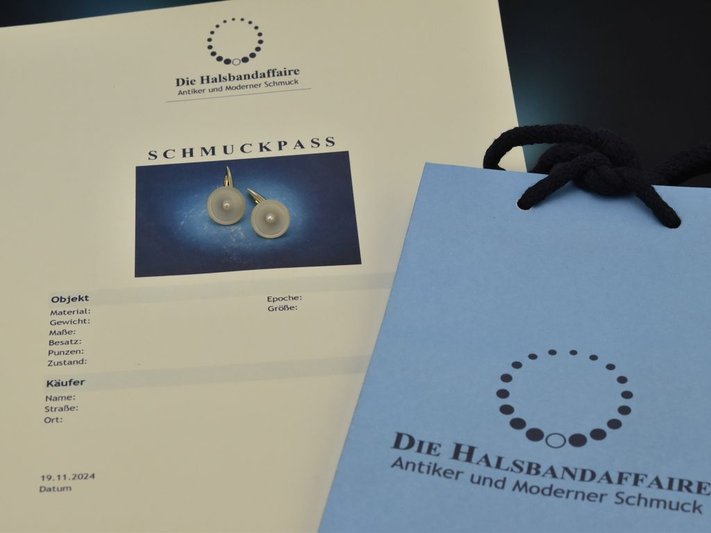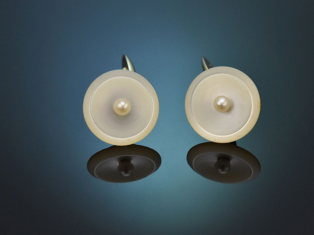 The classic round cufflinks are made of finely shimmering mother-of-pearl and feature a small seed pearl in the centre. On the back, they each have a gold bar with a clasp.
