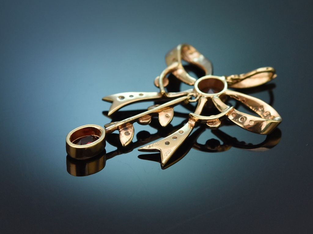 The pendant is modelled in a harmoniously curved bow shape and captivates with its delicate, balanced design. At the centre of the bow sits a round faceted garnet in an intense red colour, which gives the piece a warm, elegant aura. From this central element extends a movable pendulum made of delicately shaped leaves, which lends the piece a special lightness and liveliness. The pendant is finished with another deep red garnet, which is gently suspended from the lower end.